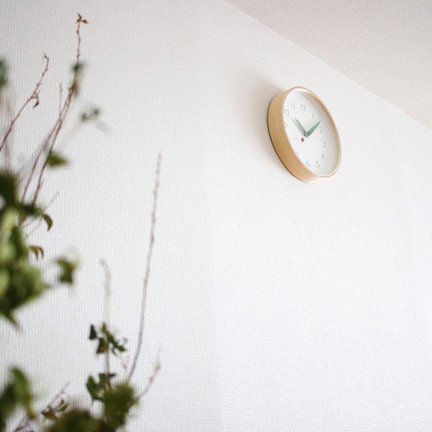 明るい木目のフレームに、白い文字盤が柔らかく調和。