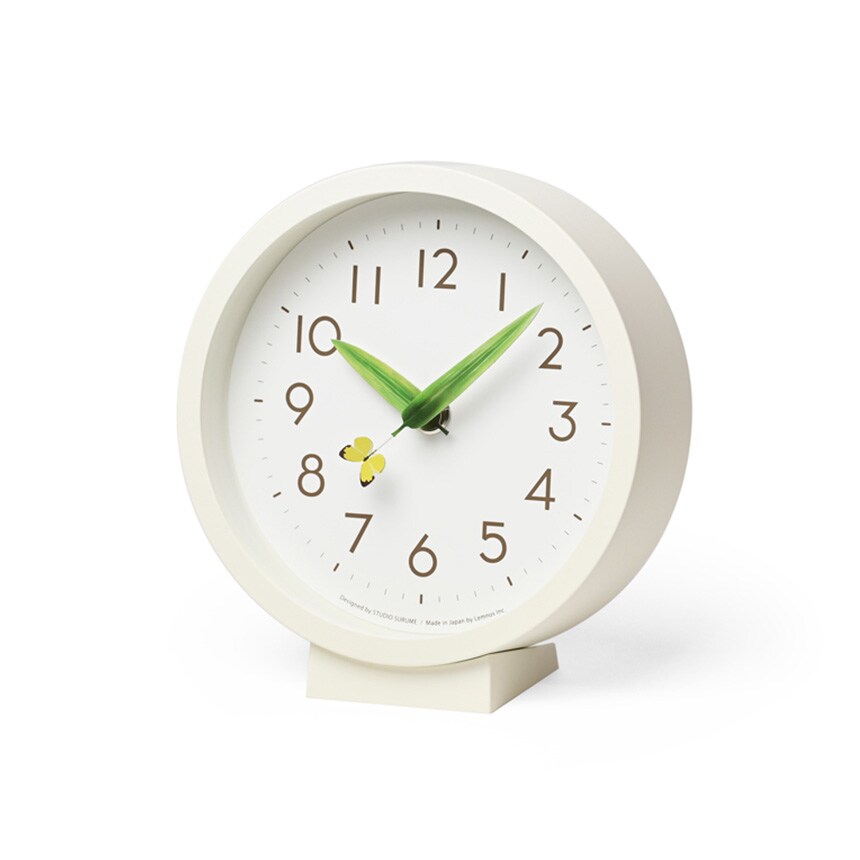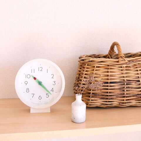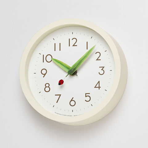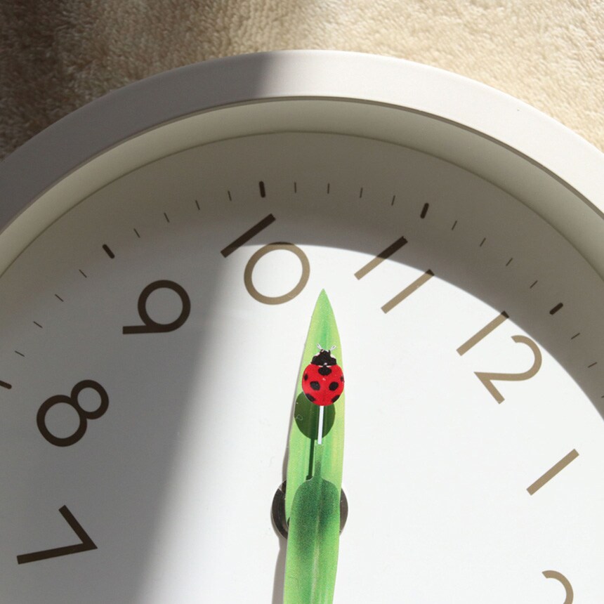 「とまり木の時計 mini」は、時計の針に葉っぱと昆虫をモチーフとした、遊び心あふれるデザインの掛け時計です。