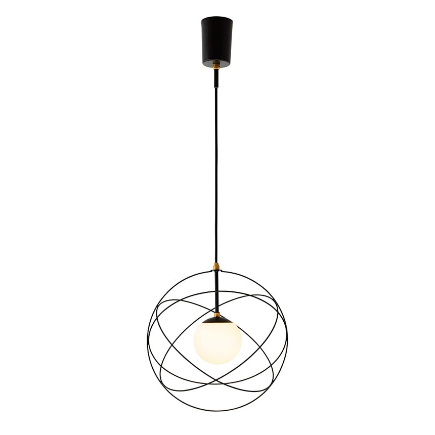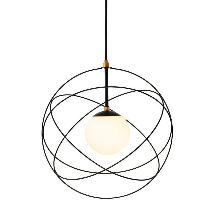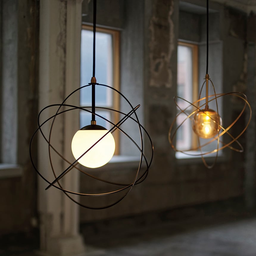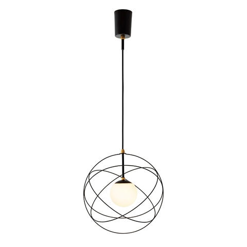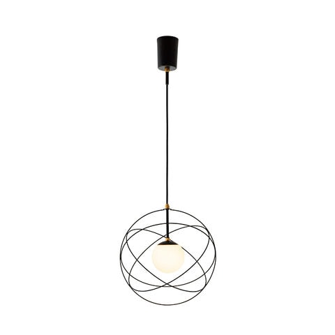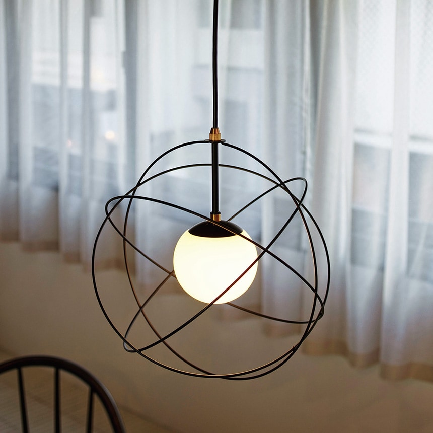 惑星軌道をイメージしたコズミックデザインのペンダントライト ワイヤーフレーム内に浮遊するガラスボールが特徴的な、宇宙を感じさせるデザイン。