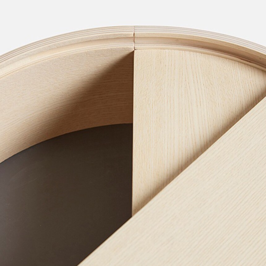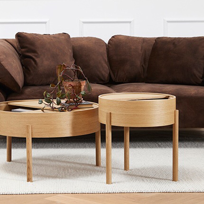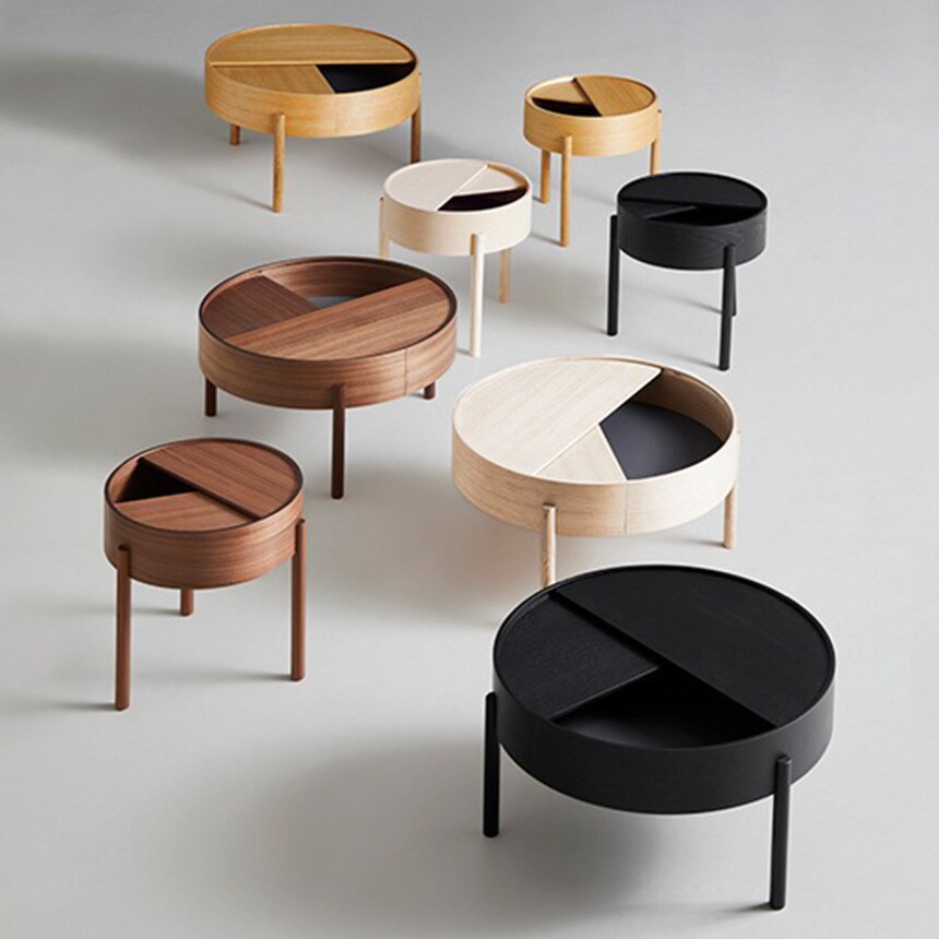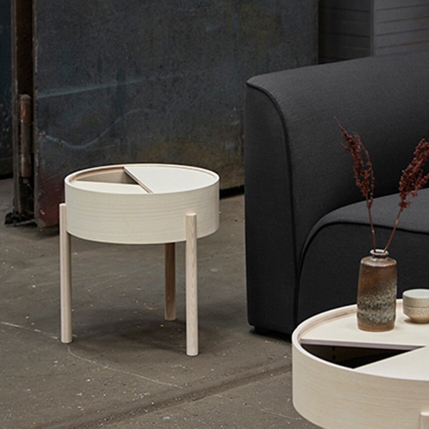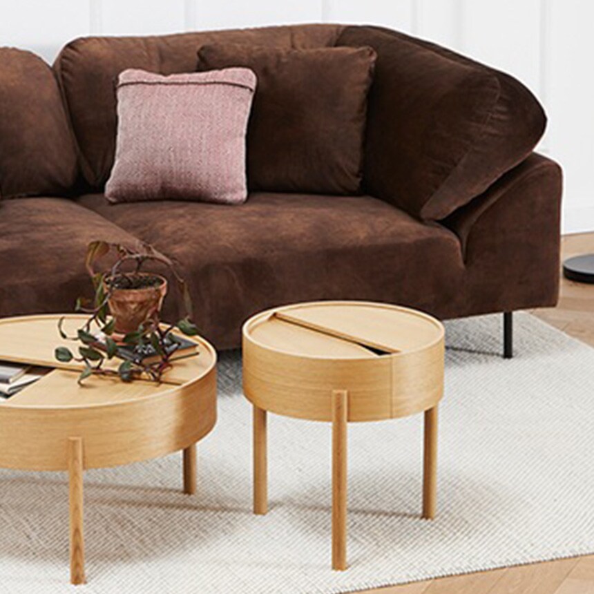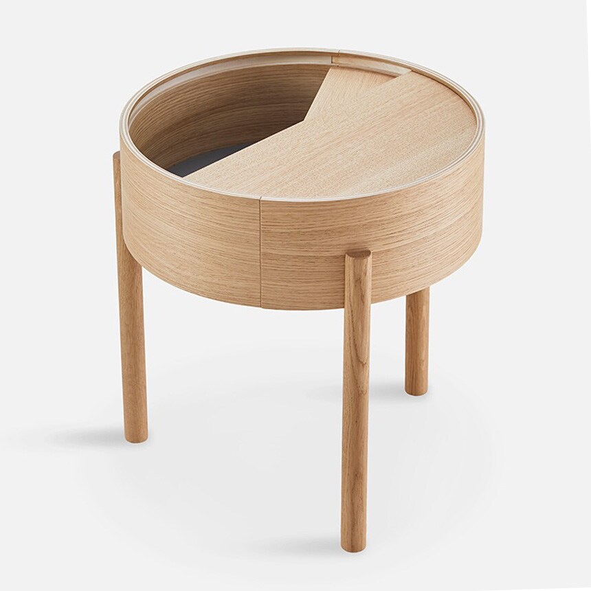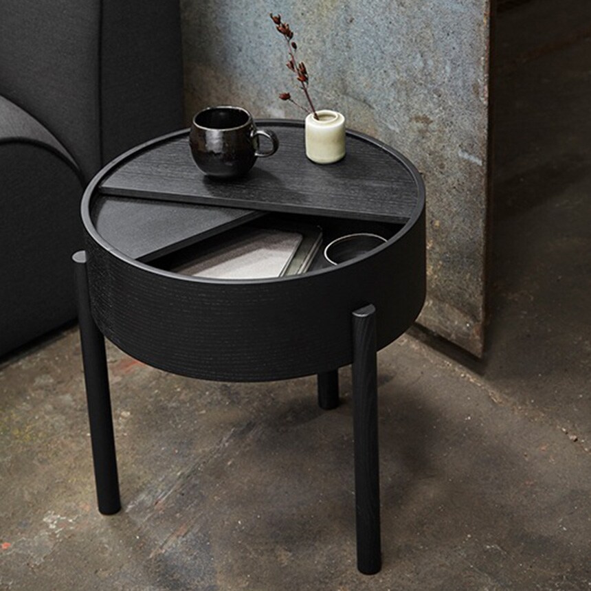 遊び心と実用性を兼ね備えた円形サイドテーブル 「アーク サイドテーブル」は、収納機能を備えた円形のデザインテーブル。