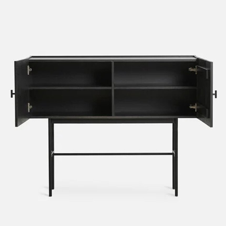 エレガントな金属脚とのコントラスト金属製の安定した脚部がキャビネットを床面から持ち上げ、軽やかな印象を演出。