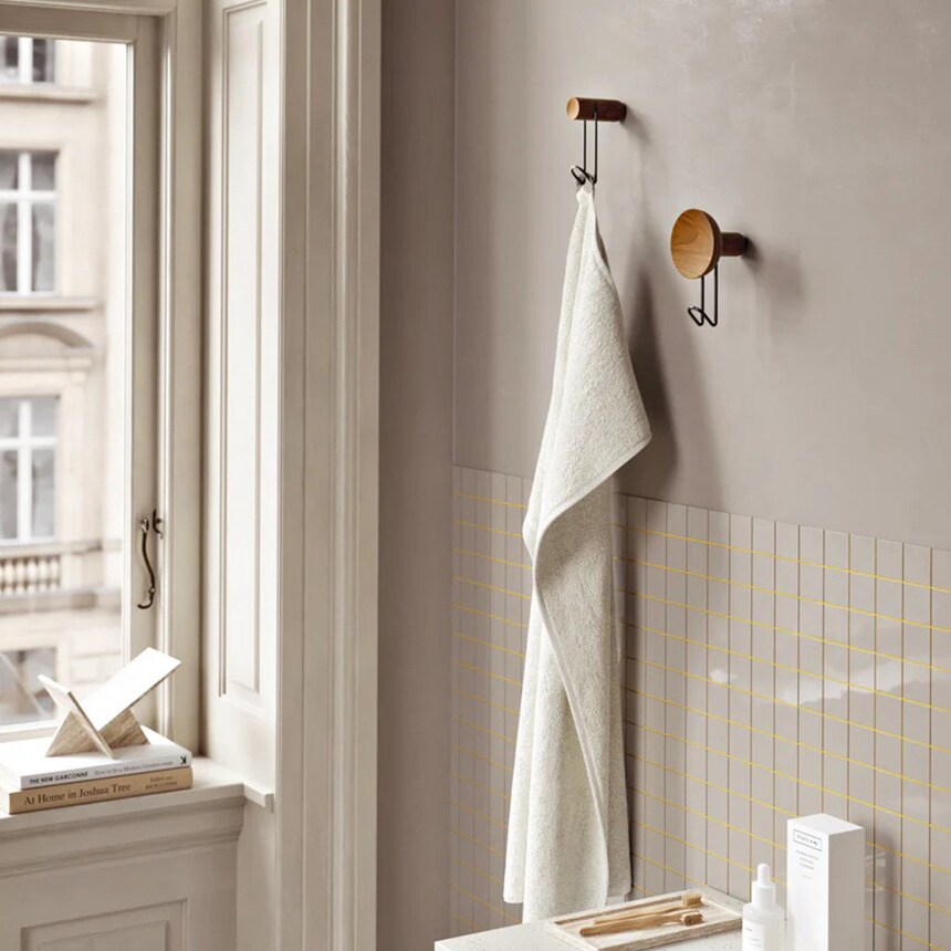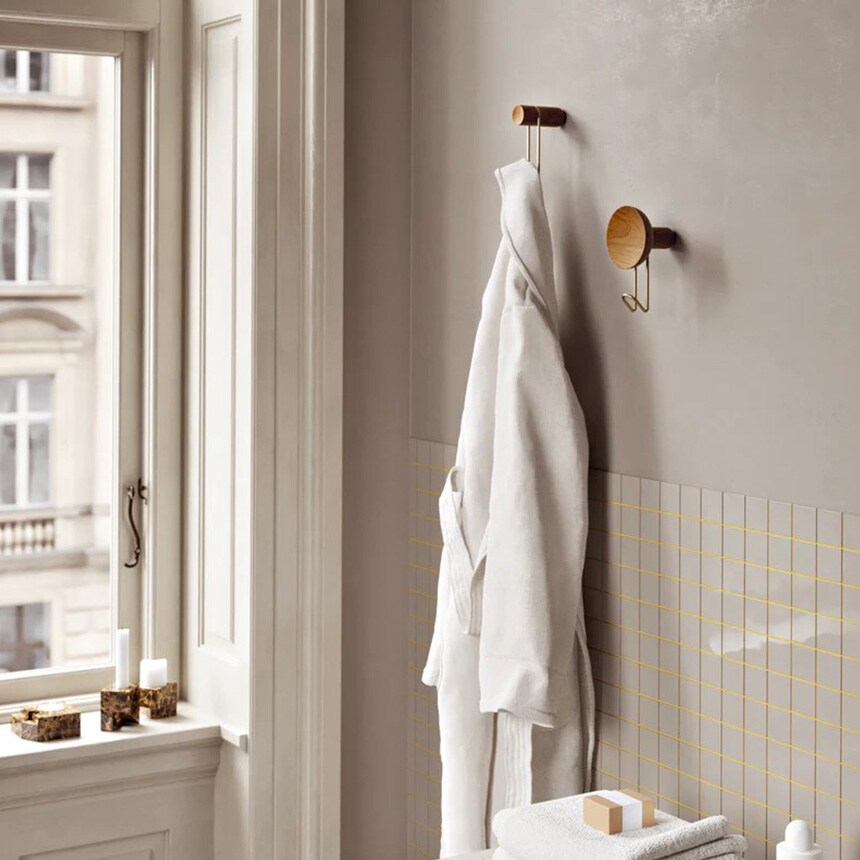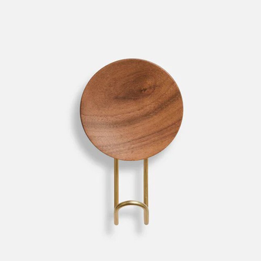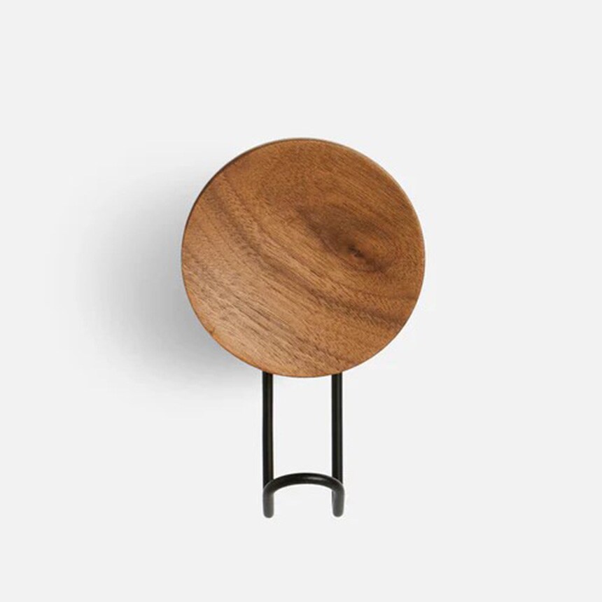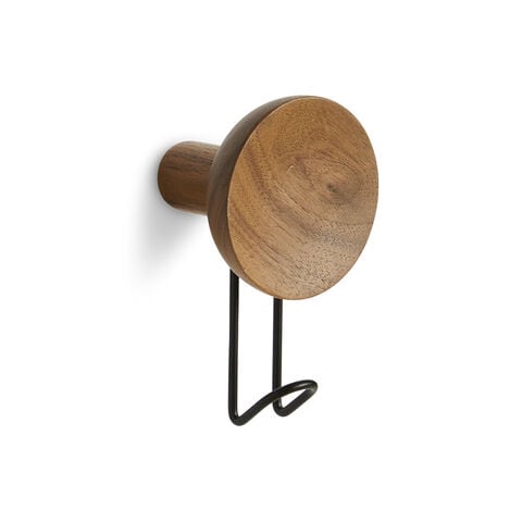 木製の凹面がデザインに彫刻的なディテールをもたらし、丈夫な金属製フックに温かみとバランスを加えています。