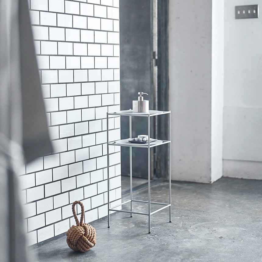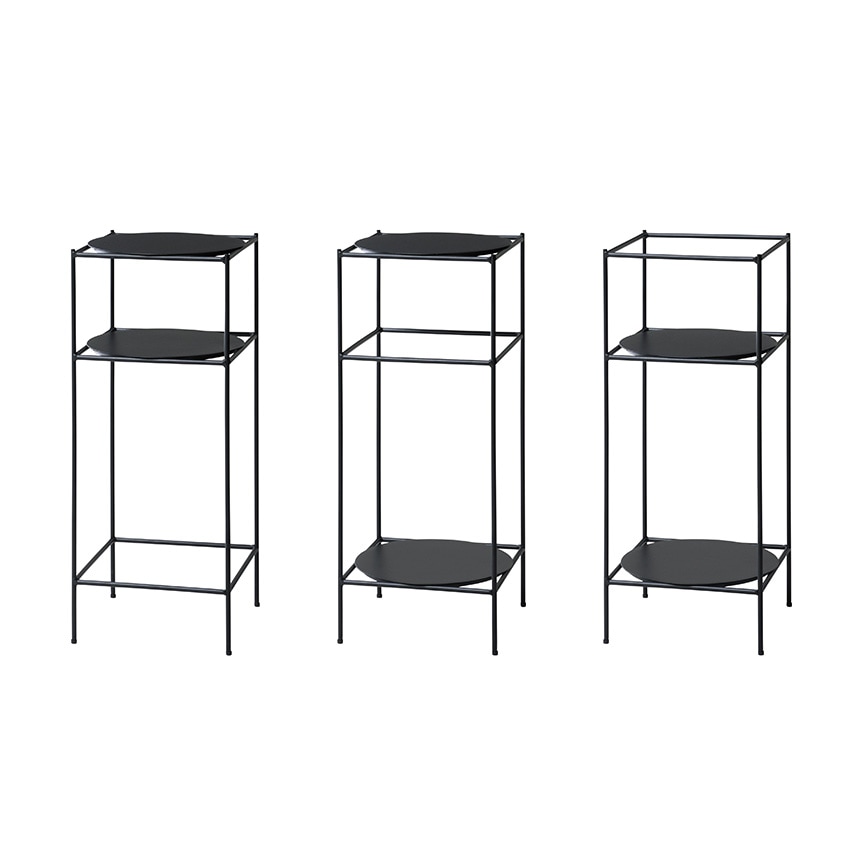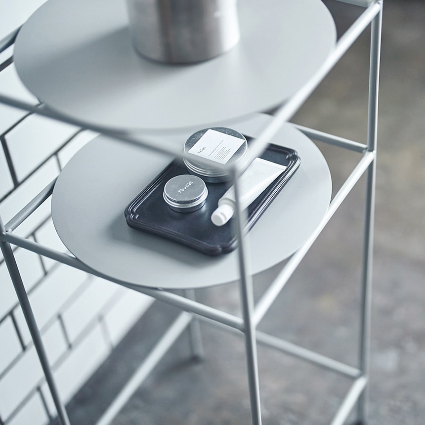 スマートなスチールフレームに、丸い棚板を合わせた軽やかな佇まい。
