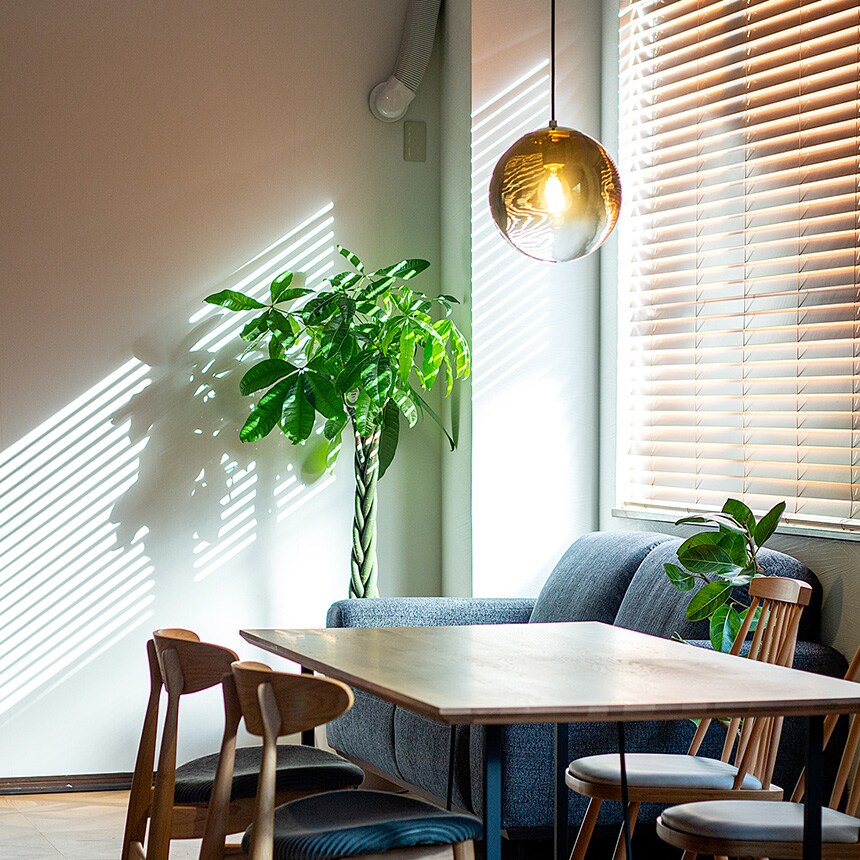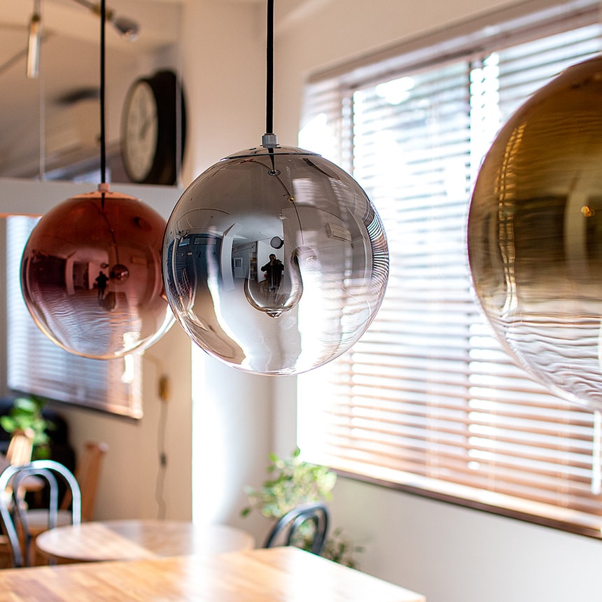まるで空間に溶け込むオブジェのような目を引く球体の天井照明。