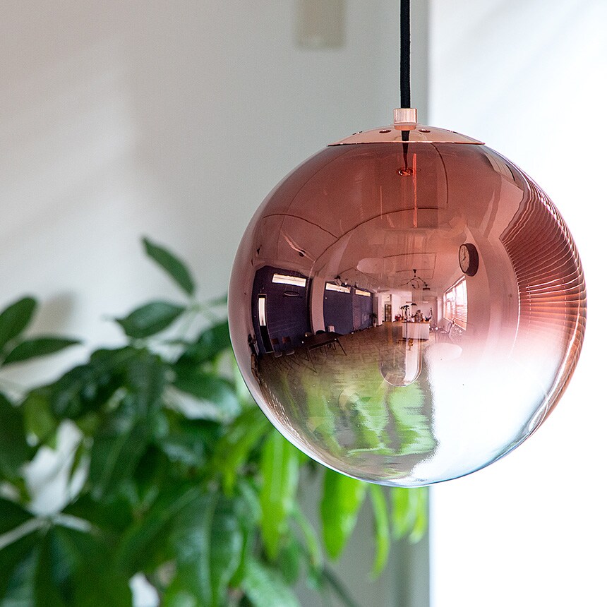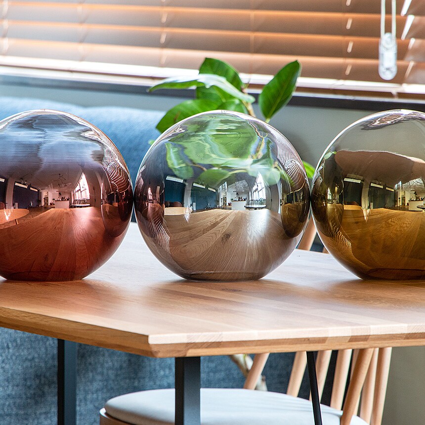鏡面のようなめっき加工が施されたガラスシェードは、光や周囲の景色を映し込み、
