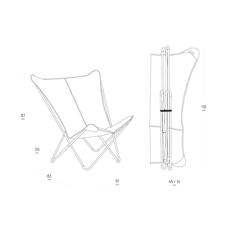 ポール状に折りたたんでコンパクトに持ち運べる、軽快なデザインのバタフライチェア。