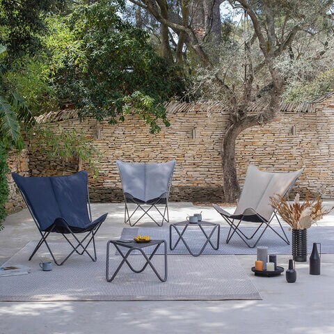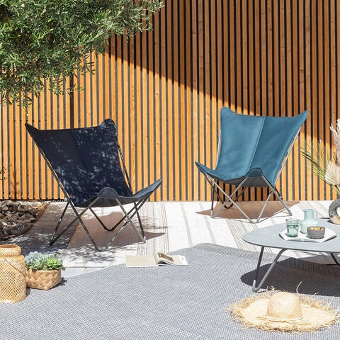 ポール状に折りたたんでコンパクトに持ち運べる、軽快なデザインのバタフライチェア。