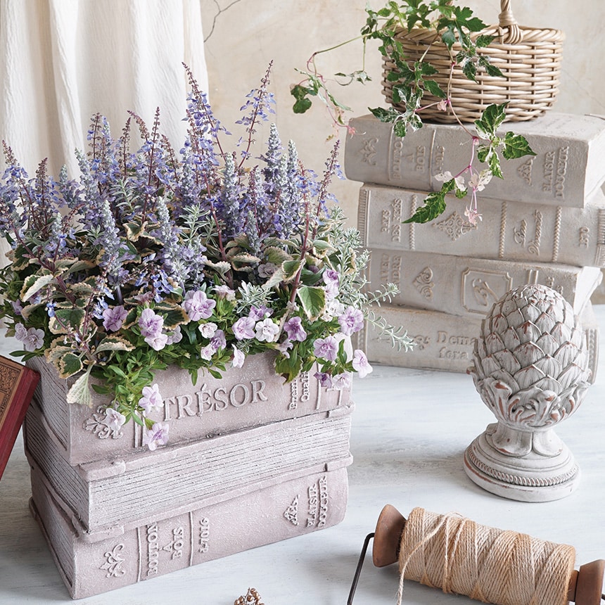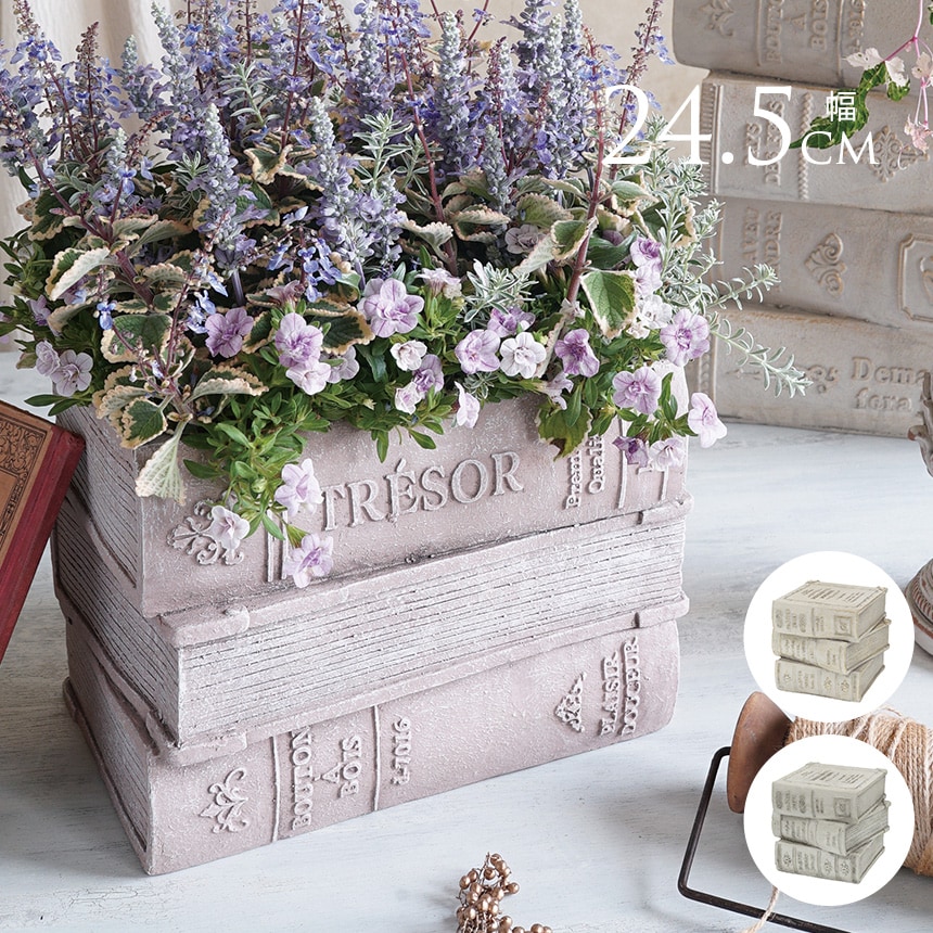 本をかたどったデザインが存在感を放ち、植物がなくてもそのままインテリアオブジェとして楽しめます。