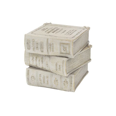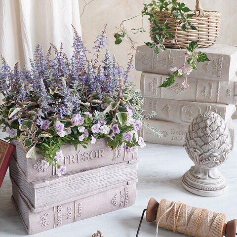 無造作に積み重ねた本をモチーフにしたアンティーク調の花台。