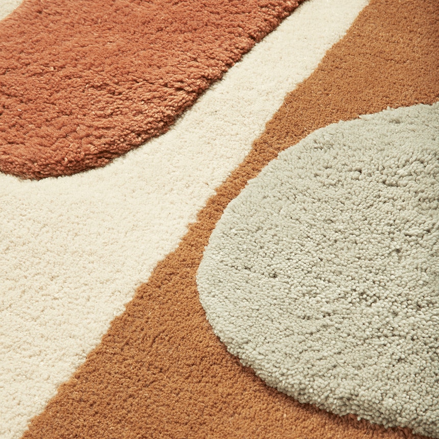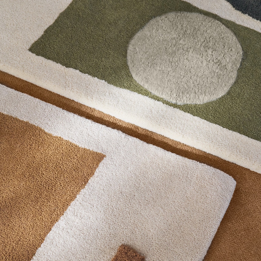現代アートを思わせる幾何学的なデザインが印象的なウールラグ 芸術性と職人技が融合したBlocoタフテッドラグは、どんな空間にも深みと個性を与える上質なインテリアアイテムです。