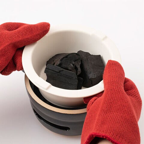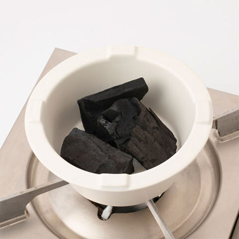 2:五徳に炭を入れ、ガスコンロなどで加熱して火を点けます。