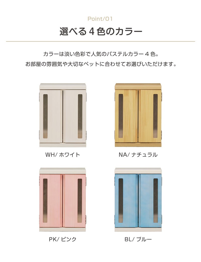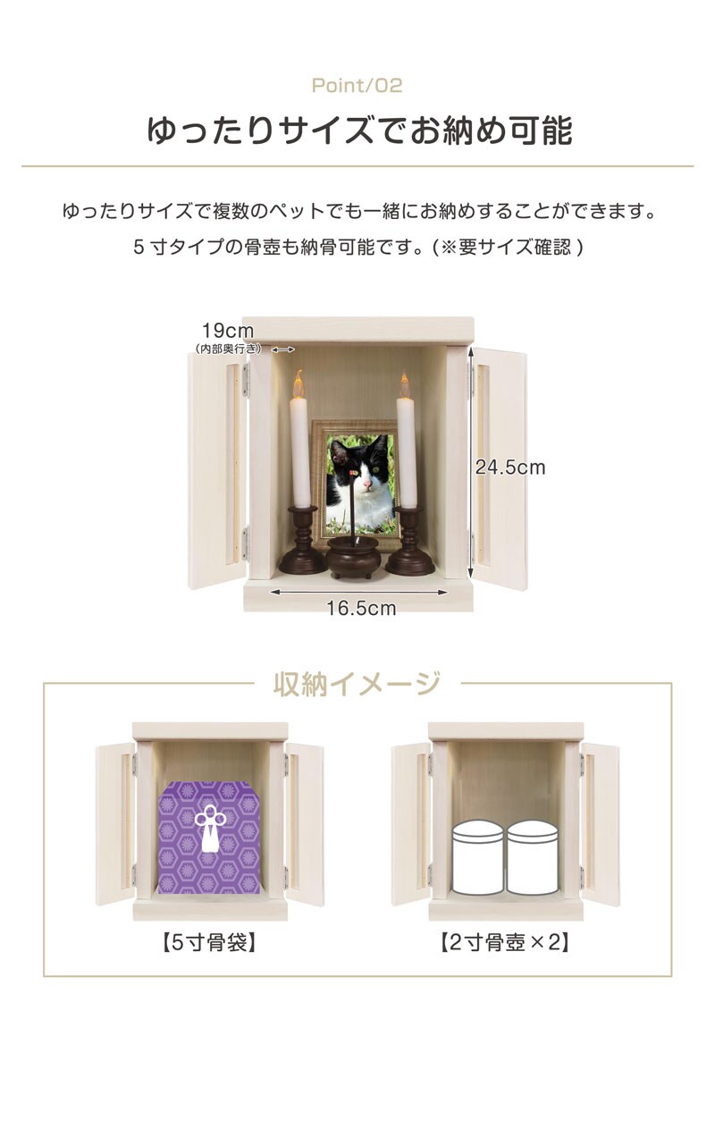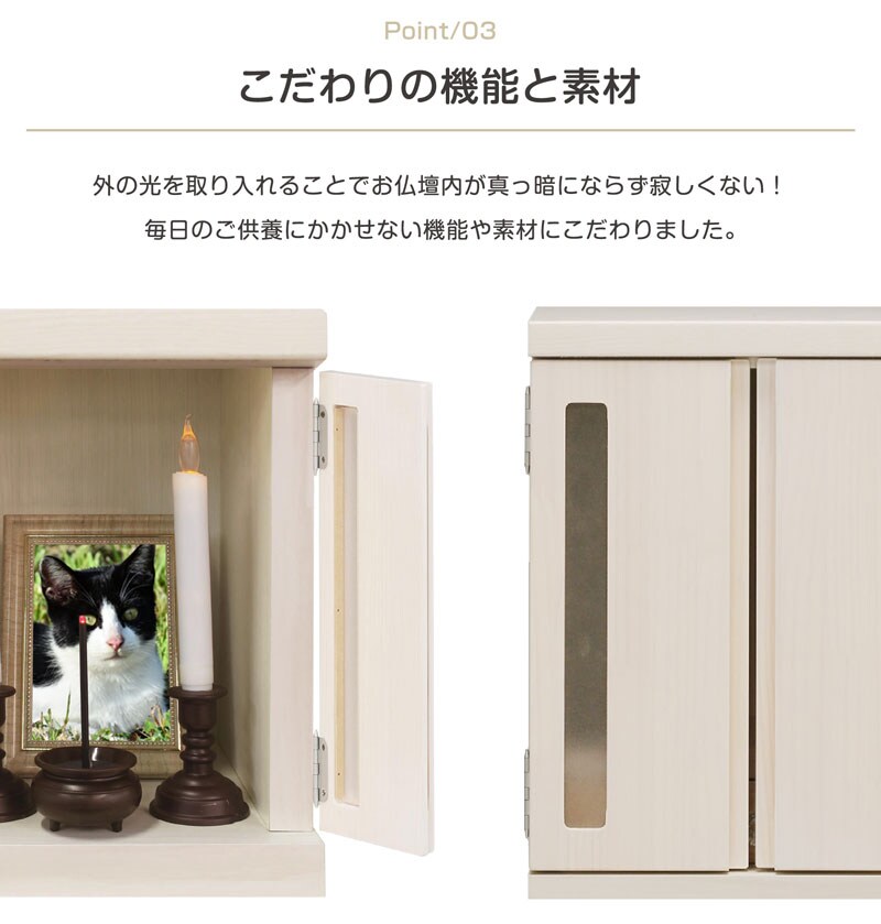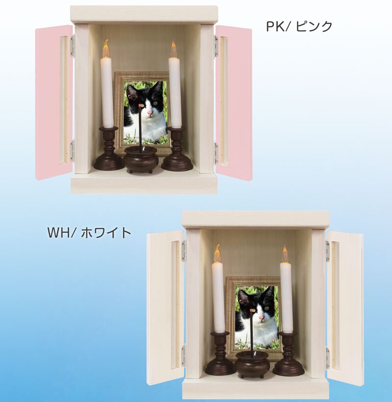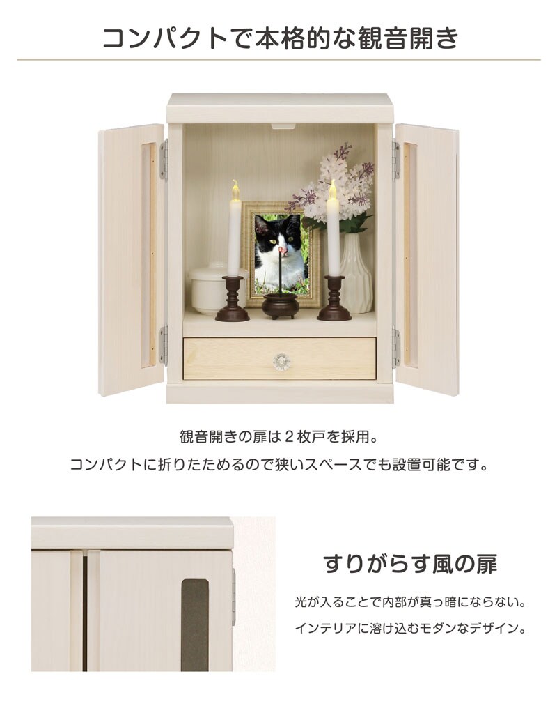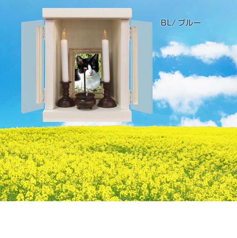 | 特徴 | ・選べる4色のパステルカラー ・馴染みやすいモダンなデザイン ・最大5寸タイプの骨壺までお納め可能 ・コンパクトで本格的な観音開き ・すりがらす風の扉 ・松を加工した癒しのパイン材を使用 |
