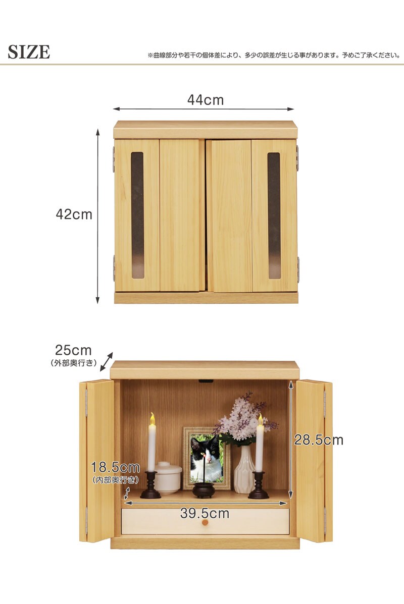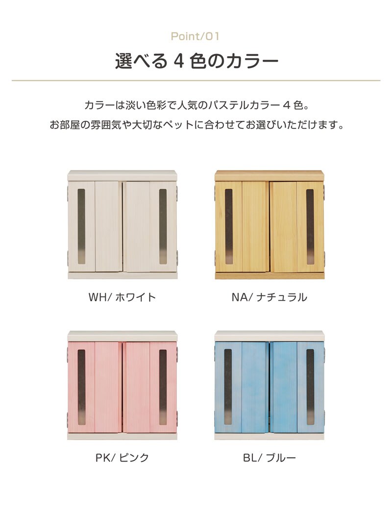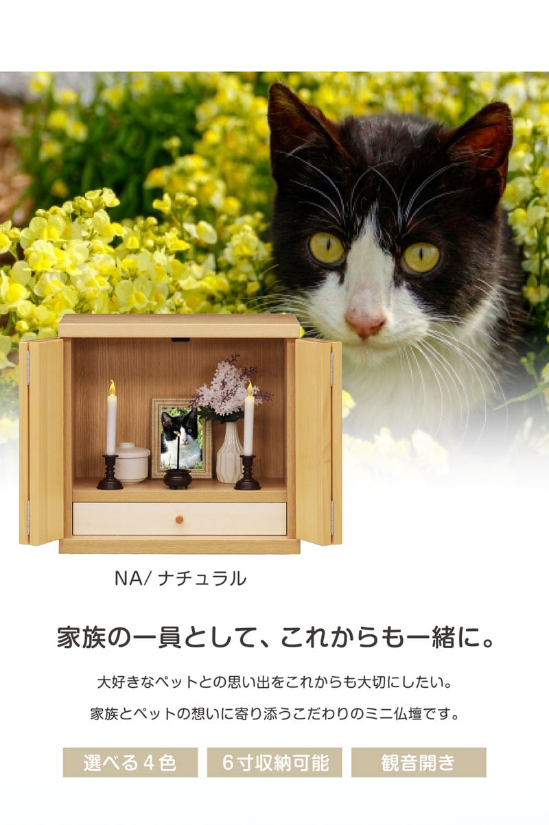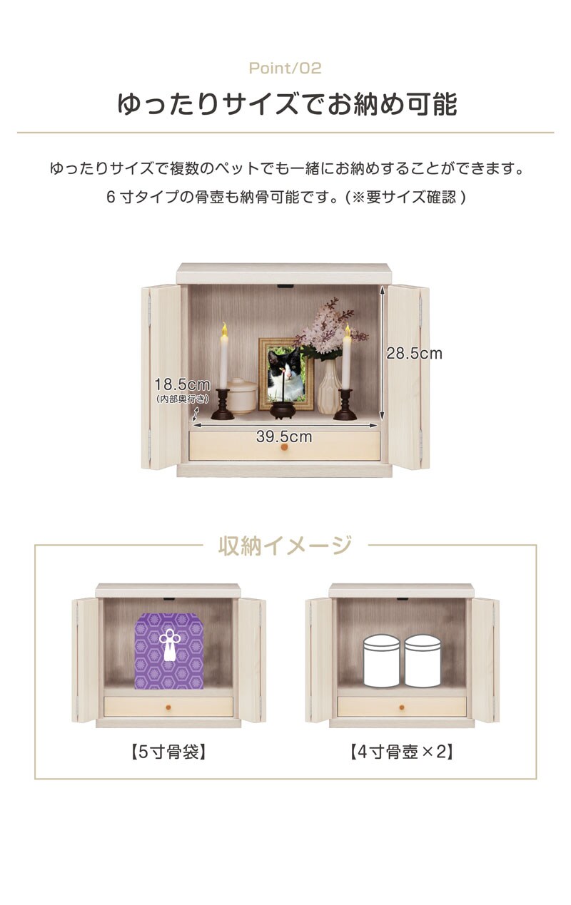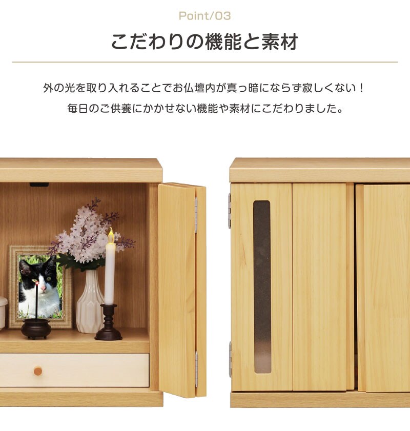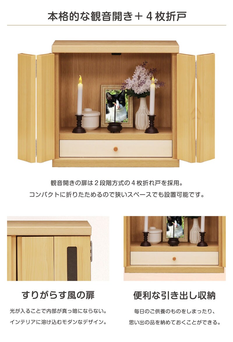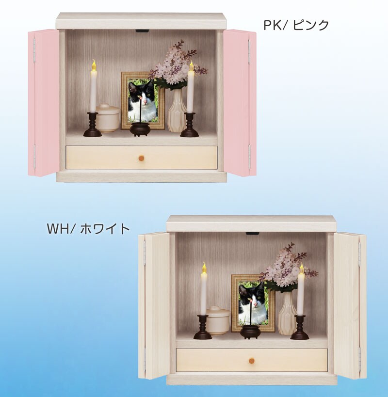 | 特徴 | ・選べる4色のパステルカラー ・馴染みやすいモダンなデザイン ・最大6寸タイプの骨壺までお納め可能 ・コンパクトで本格的な観音開き ・すりがらす風の扉 ・松を加工した癒しのパイン材を使用 |
