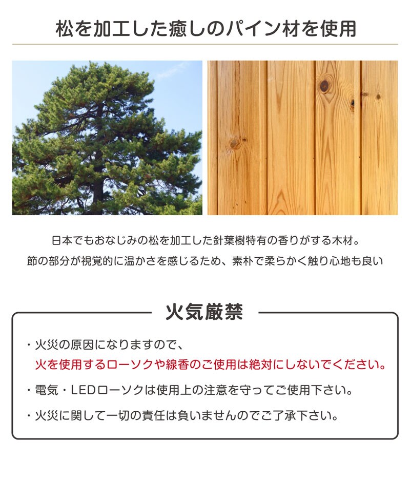 | 注意事項 | 【火気厳禁】火を使用するローソク・線香のご使用は絶対にしないでください。 |