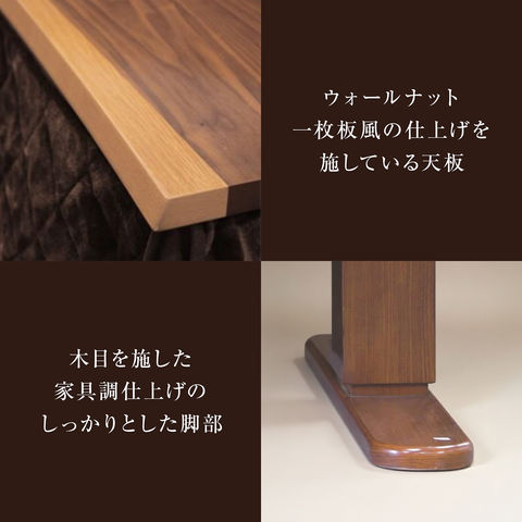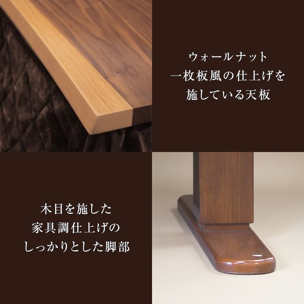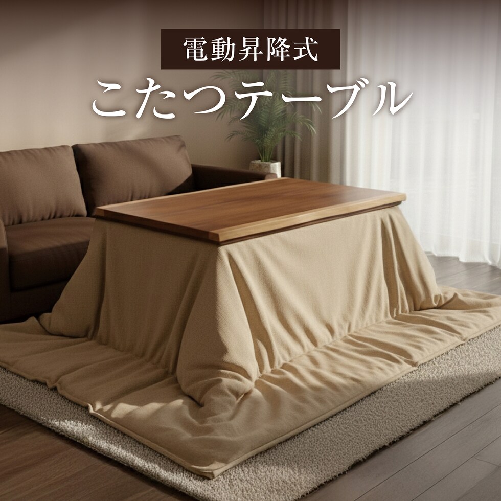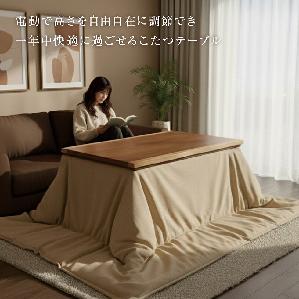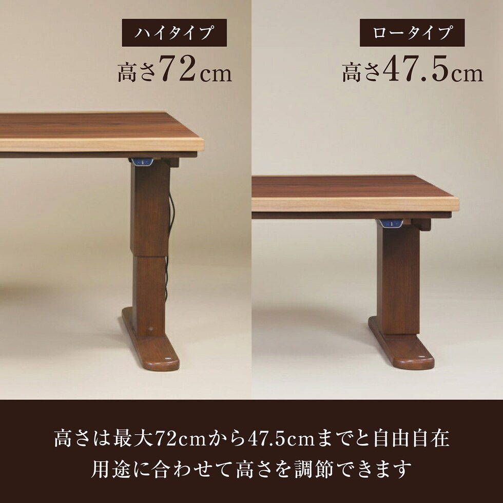 | 特徴 | 【お客様組立て】 ・電動で高さを自由自在に調節でき、一年中快適に過ごせるこたつテーブル ・春夏はダイニングテーブルとして ハイタイプは来客用にもぴったりのサイズ ・秋冬はこたつテーブルに ロータイプは和室にも合います ・高さは最大72cmから47.5cmまでと自由自在 用途に合わせて高さを調節できます ・ウォールナット一枚板風の仕上げを施している天板 ・木目を施した家具調仕上げのしっかりとした脚部 ・手元コントローラーでお好みの高さに簡単に調節できます ※ヒーターなしの昇降式テーブルも販売しております |