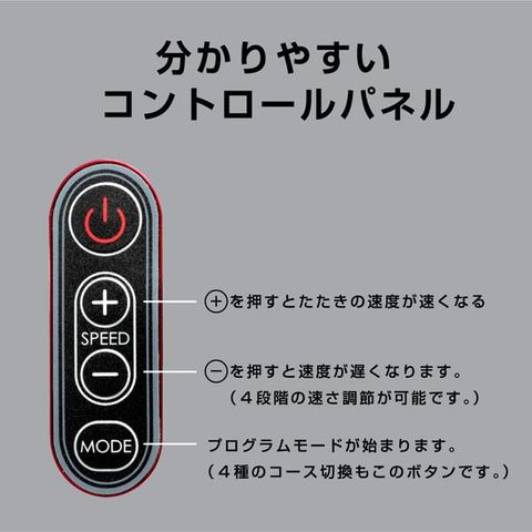 | 特徴 | ・片手で楽に扱えるハンディータイプ ・強度を4段階で切り替え可能 ・目的別で使えるアタッチメントを3種類付属 ・自動でたたきのパターンが変化するプログラムを4種類内蔵 ・15分で自動的にマッサージを停止するオートオフ機能搭載 |