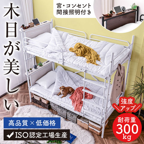 強度アップ 2段ベッド 二段ベッド ベッド パイプベッド 宮 宮棚 LED ライト 照明 コンセント 分割 分離 はしご 木目 パイプ 頑丈 シングル 宮付き ムーンLIGHT 本体のみ / ホワイト / -ART