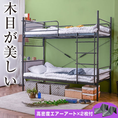 強度アップ 2段ベッド 二段ベッド ベッド パイプベッド 宮 宮棚 LED ライト 照明 コンセント 分割 分離 はしご 木目 パイプ 頑丈 シングル 宮付き ムーンLIGHT / グレー / (高密度エアアート2枚付) -ART
