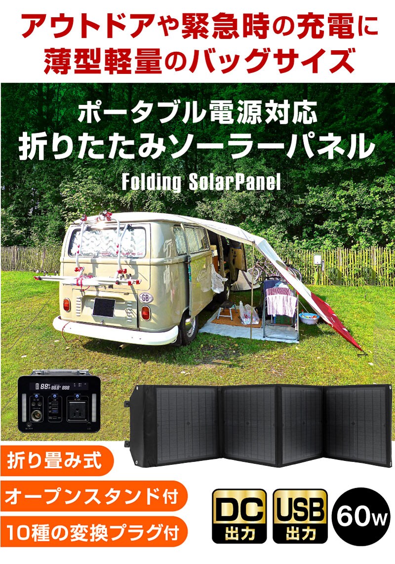 ソーラーパネル 60W ソーラーチャージャー 折りたたみ式 DC/USB スマホやタブレット 超薄型 軽量 コンパクト ポータブル電源用 折り畳み 太陽光発電 / ブラック / -ART