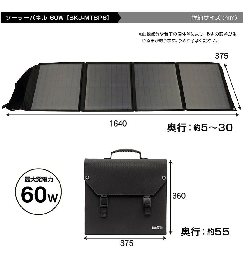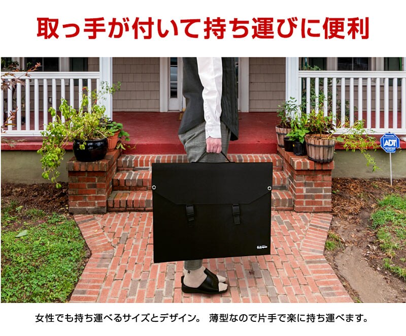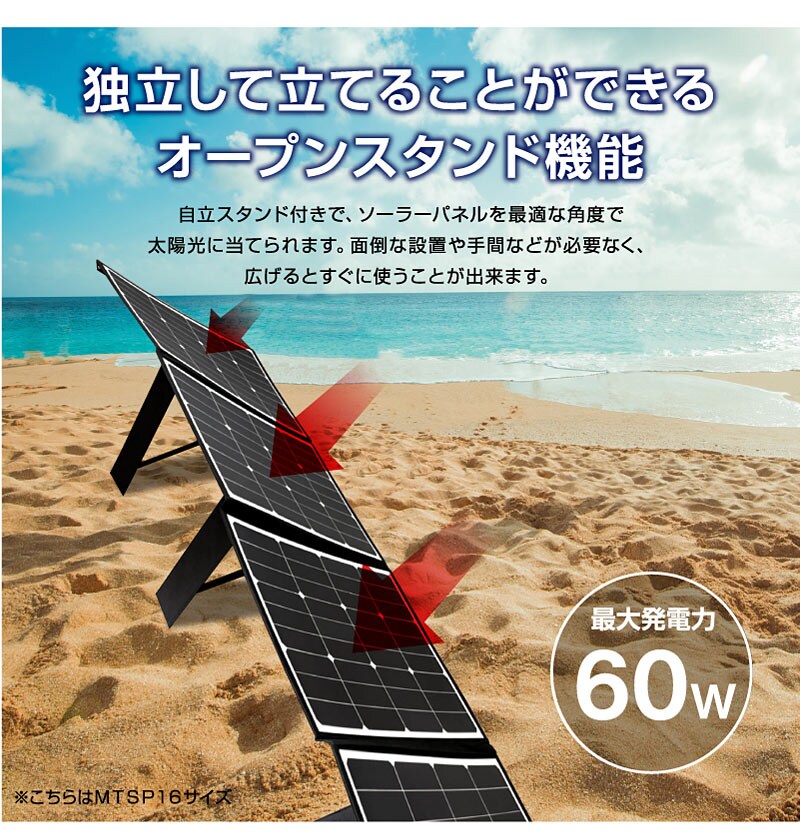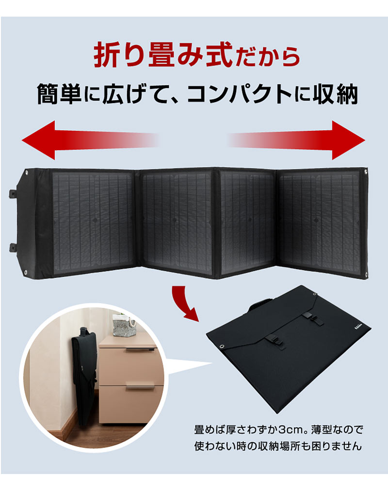 | 特徴 | ・広げるだけで簡単に設置ができます ・コンパクトに折り畳みが可能 ・軽量なので女性でも持ち運び可能 ・10種類のアタッチメント付きで、いろんなポータブル電源対応 ・コードなどを収納できるポケット付き ・独立して立てることができる、スタンド装備 |