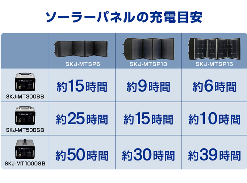 | 充電時間の目安 | SKJ-MT300SB:約9時間 SKJ-MT500SB:約15時間 SKJ-MT1000SB:約30時間 |