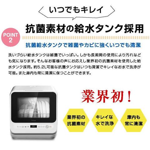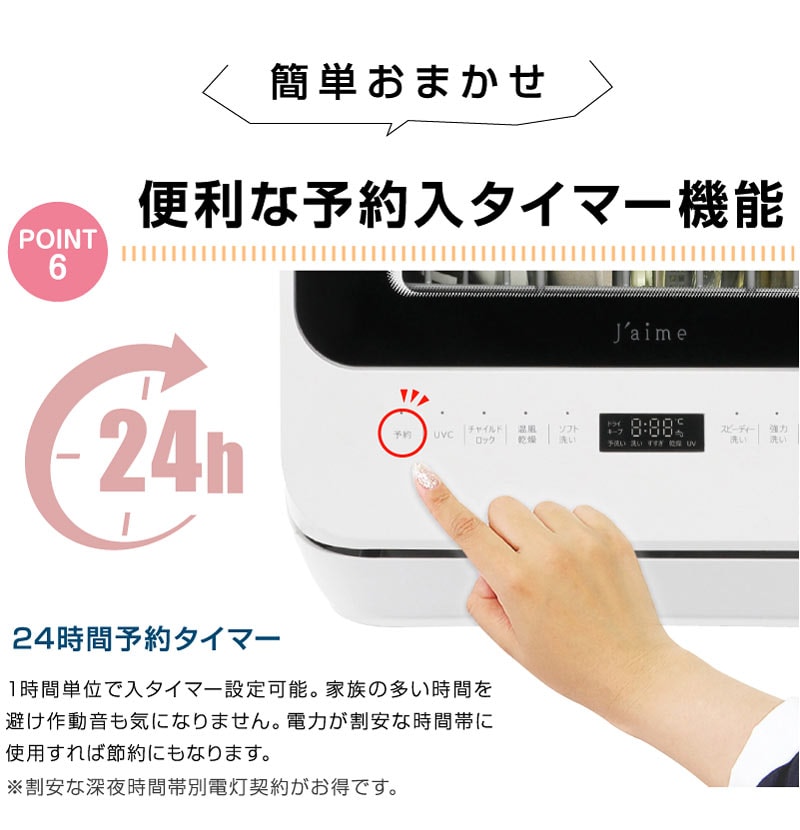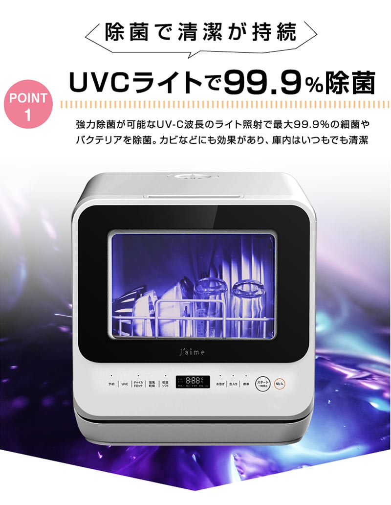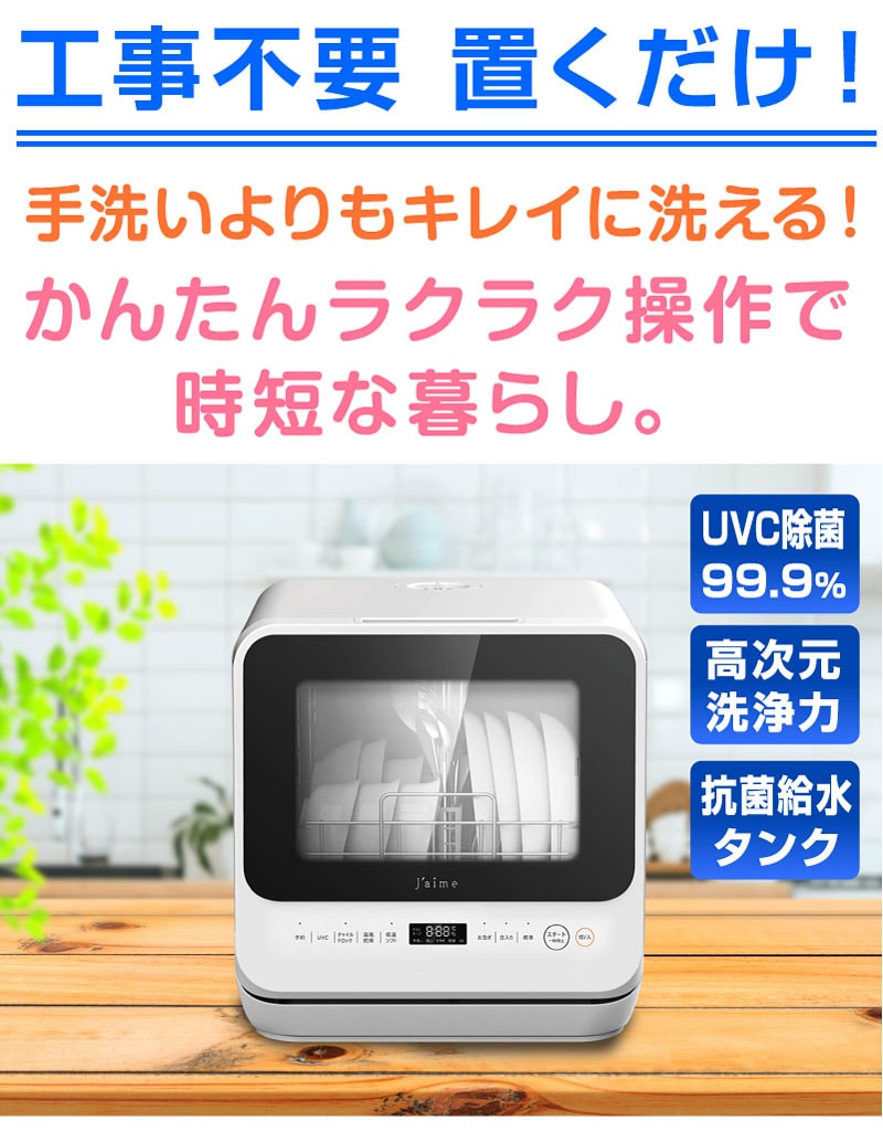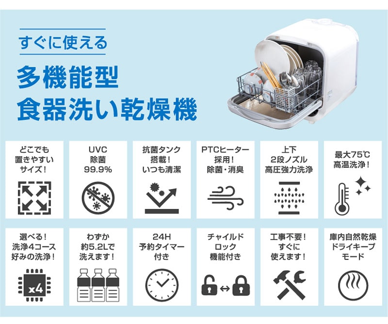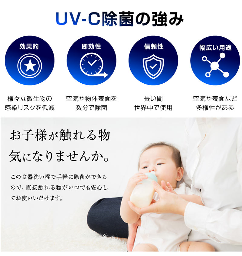 | 特徴 | ・UVCモード:全てのコースでUVC除菌ライトの照射 ・庫内や食器などを常に除菌・清潔 ・UVC温風乾燥モードで食器はもちろん手洗いした小物や布マスク、哺乳瓶等も除菌可能 ・予約/24時間:1時間単位で予約可能 家族の多い時間を避け、夜間の電気代節約 ・チャイルドロック付き 長押し3秒:育児など大変なお母さんお父さんに安心 ・強化ガラスで大きなフロントパネル:大きなお皿も取り出しやすく、UVC非透過ガラス採用 ・便利な給水トレイ&ボトル付き:給水しやすい給水トレイと計量ボトル付きで簡単給水が可能 |