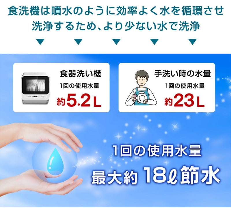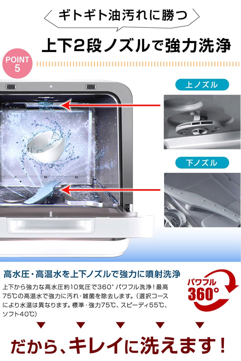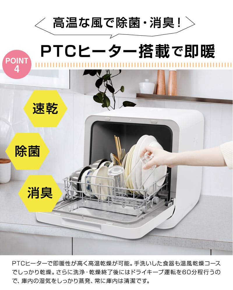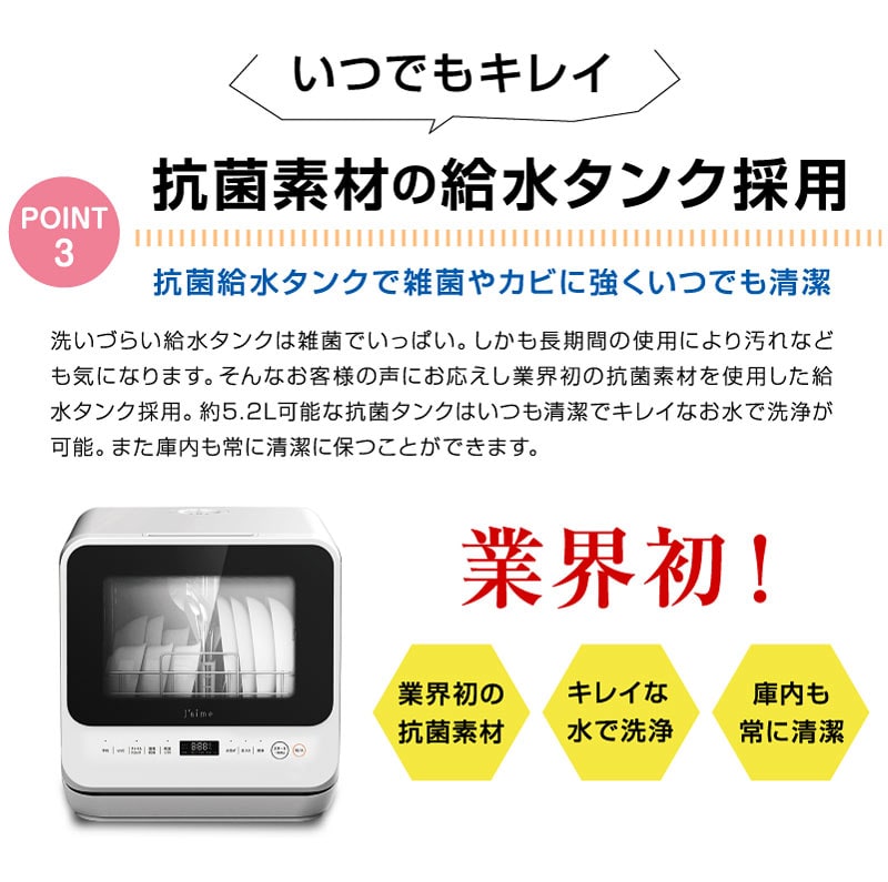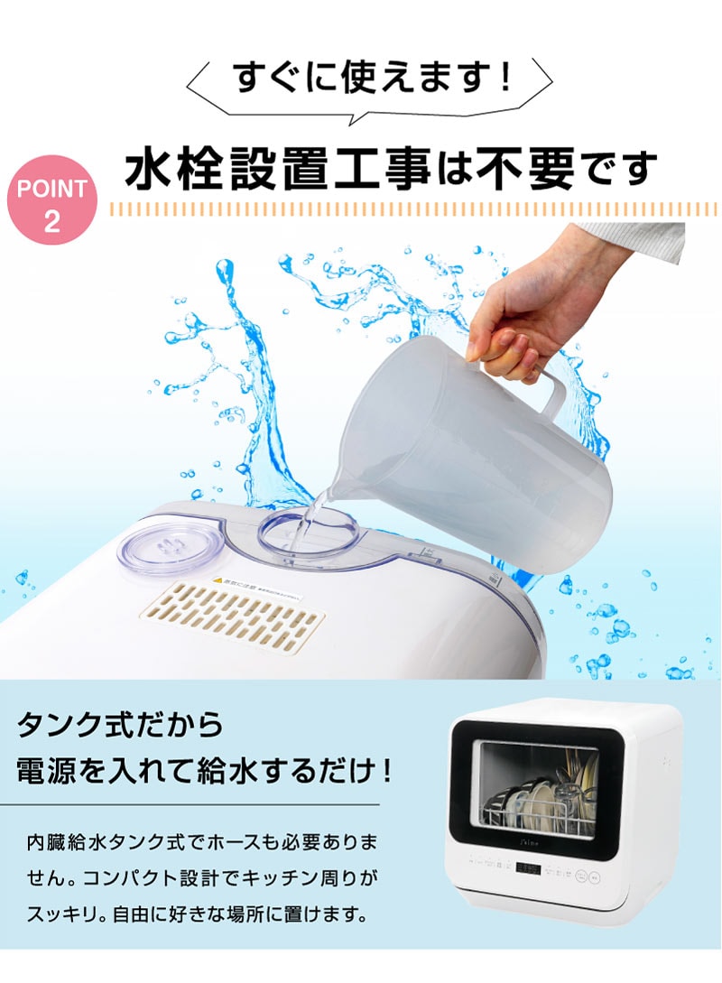 | 特徴 | ・UVCモード:全てのコースでUVC除菌ライトの照射 ・庫内や食器などを常に除菌・清潔 ・UVC温風乾燥モードで食器はもちろん手洗いした小物や布マスク、哺乳瓶等も除菌可能 ・予約/24時間:1時間単位で予約可能 家族の多い時間を避け、夜間の電気代節約 ・チャイルドロック付き 長押し3秒:育児など大変なお母さんお父さんに安心 ・強化ガラスで大きなフロントパネル:大きなお皿も取り出しやすく、UVC非透過ガラス採用 ・便利な給水トレイ&ボトル付き:給水しやすい給水トレイと計量ボトル付きで簡単給水が可能 |