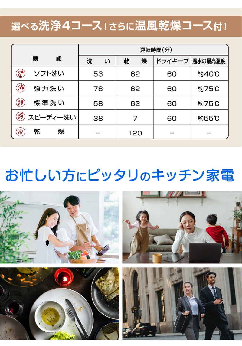 | 洗浄モード | 標準コース/120分:食後すぐの食器洗いや、通常の洗浄に最適です。 強力コース/140分:しつこいガンコな油汚れなどを時間をかけて高温洗浄します。 スピーディコース/45分:つけ置き洗い、水洗い後や軽い油汚れなどに最適です。 ソフトコース/115分:熱に弱いプラスチック製食器などもしっかりと洗えます。 温風乾燥コース/120分:手洗い後の食器乾燥や皿のあたためなどに最適です。 ※ドライキープとは、各コースの乾燥終了後、約60分間庫内の乾燥をする内部ファン稼働機能です。 |