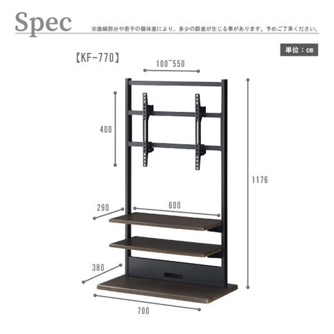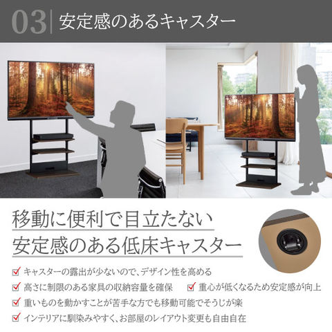 | 特徴 | ・自立式 ・棚板2枚付属 ・高さ調節可能 ・低床キャスター付でインテリアに馴染む ・配線ボックス ・ダークブラウン木目 |