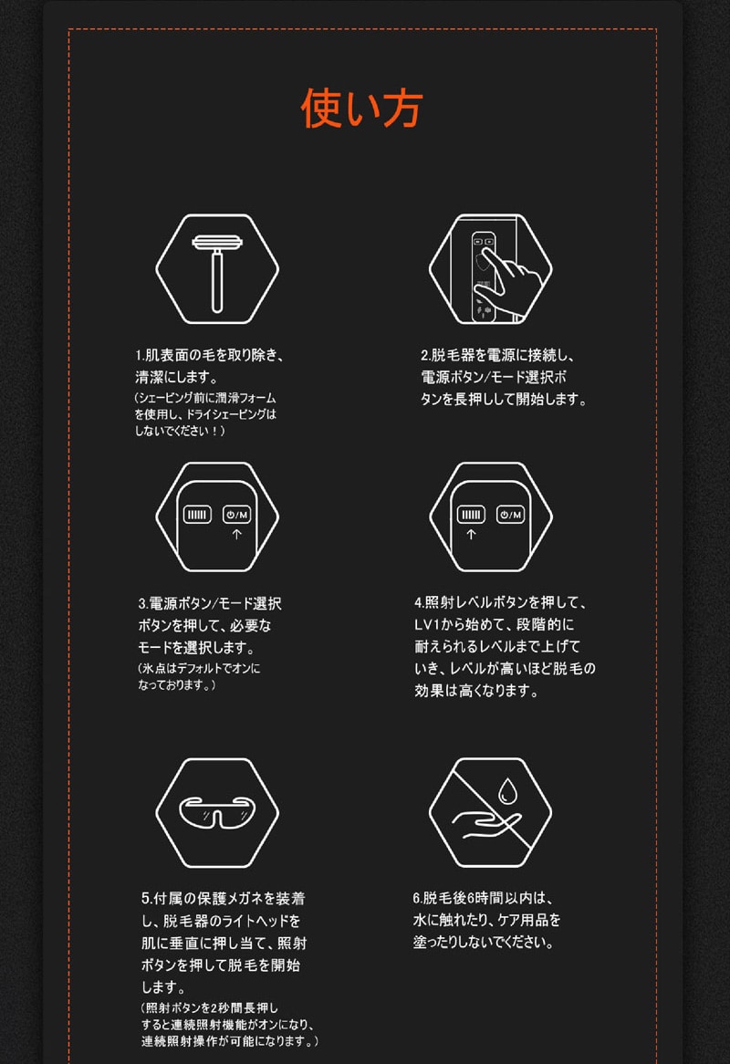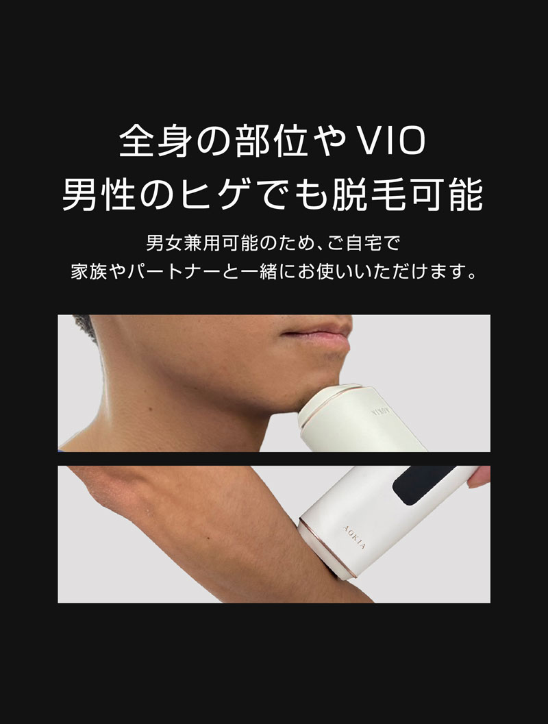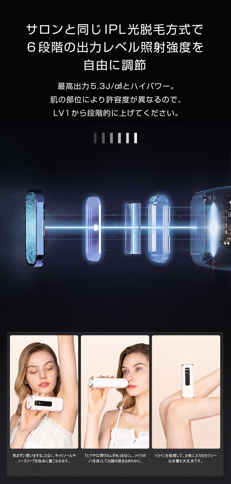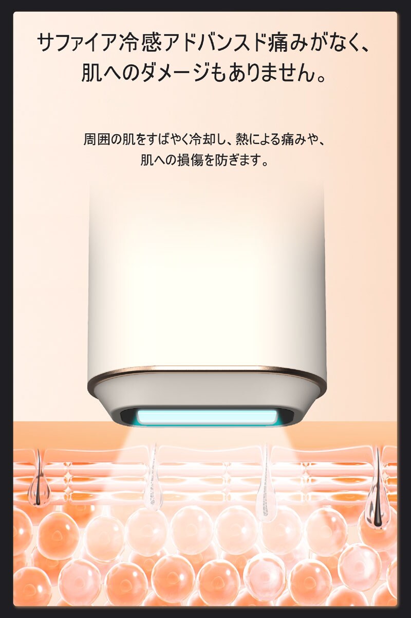 | 特徴 | ・ハイパワーなのに肌に優しい ・HIPL方式光脱毛+SR+ICE冷感 ・全身をくまなくうるすべ肌へ ・コンパクトで使いやすい ・高耐久、高機能、お手頃価格 ・男性のヒゲ、すね毛、胸毛やVIOもしっかりお手入れ可能! |