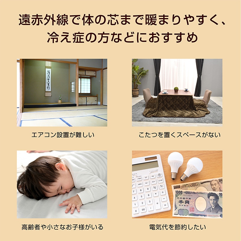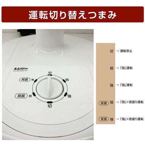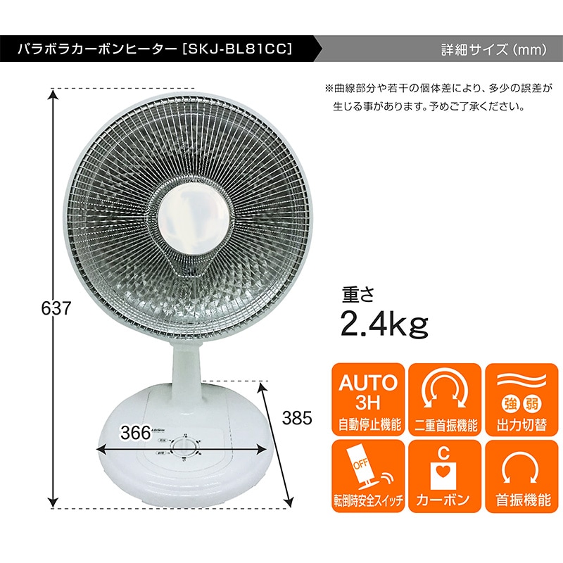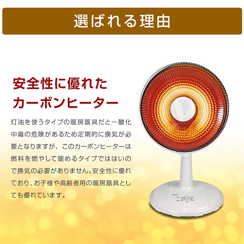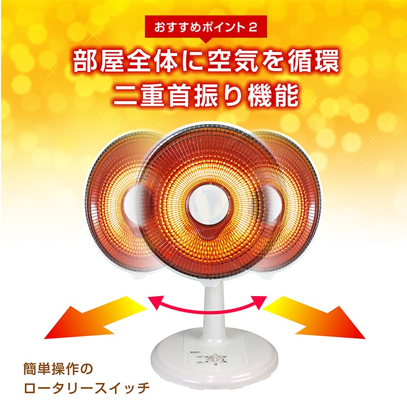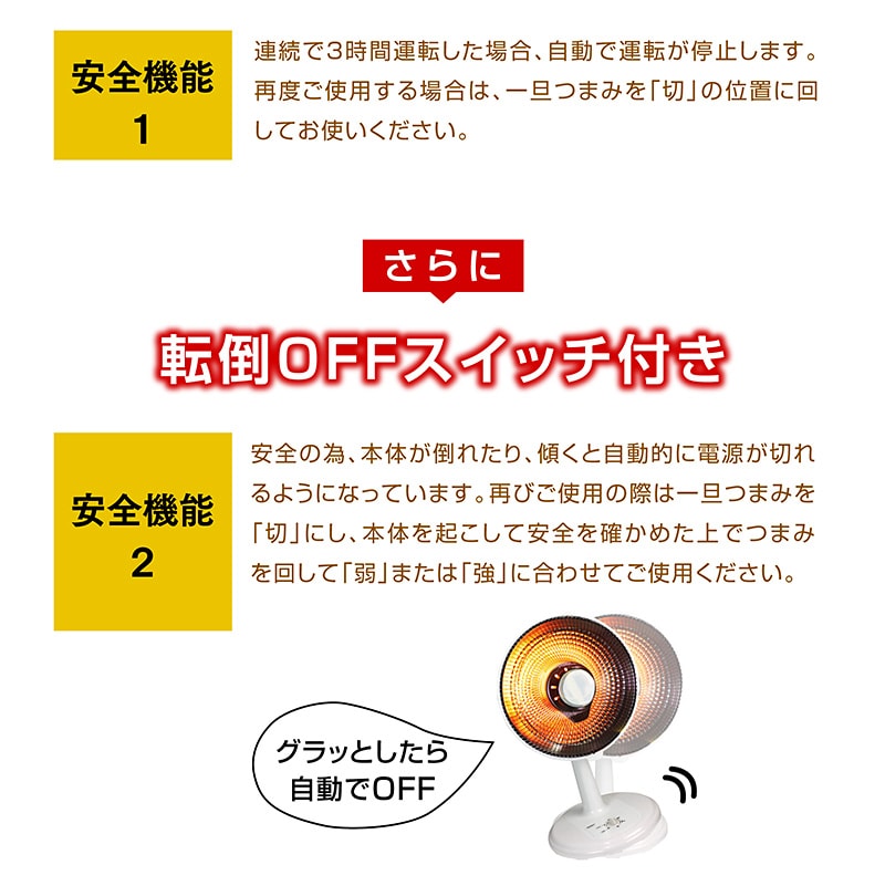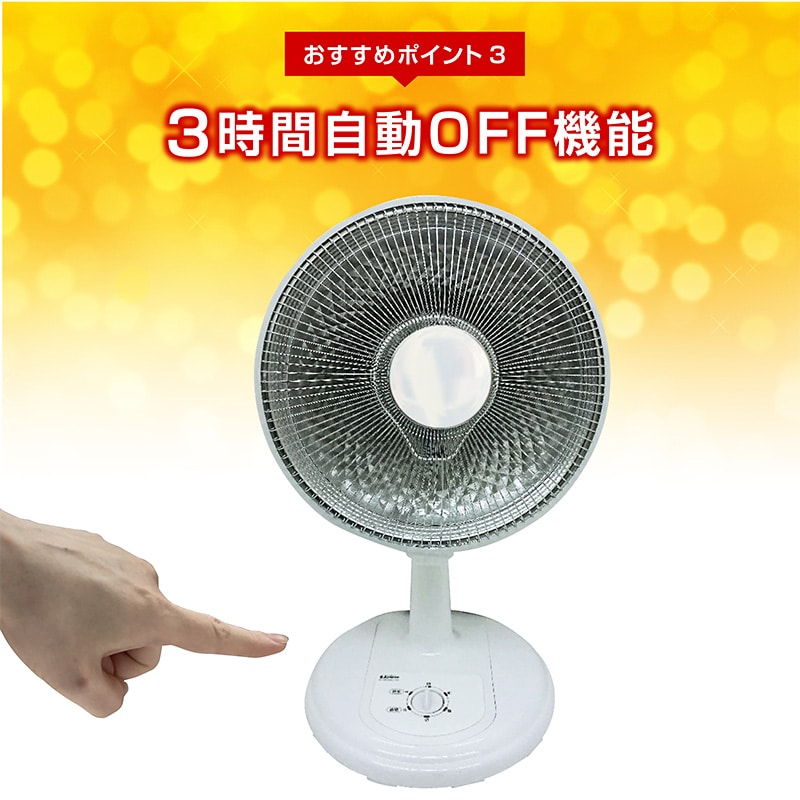 | 特徴 | ・反射効率の良いパラボラ式 ・操作が簡単なロータリースイッチ ・3時間自動OFF ・首振りはワイド幅90度 ・転倒OFFスイッチ付 |