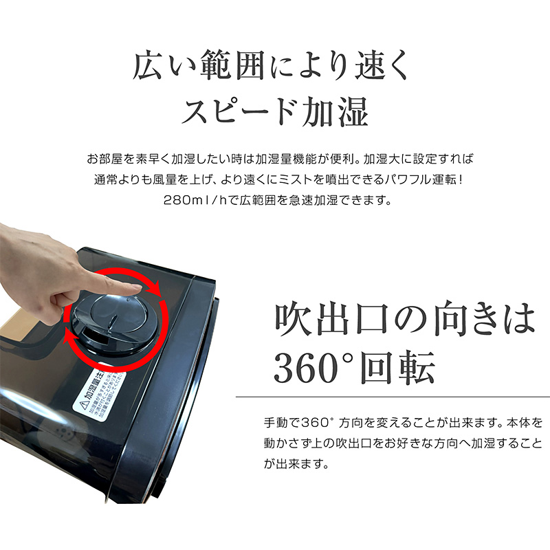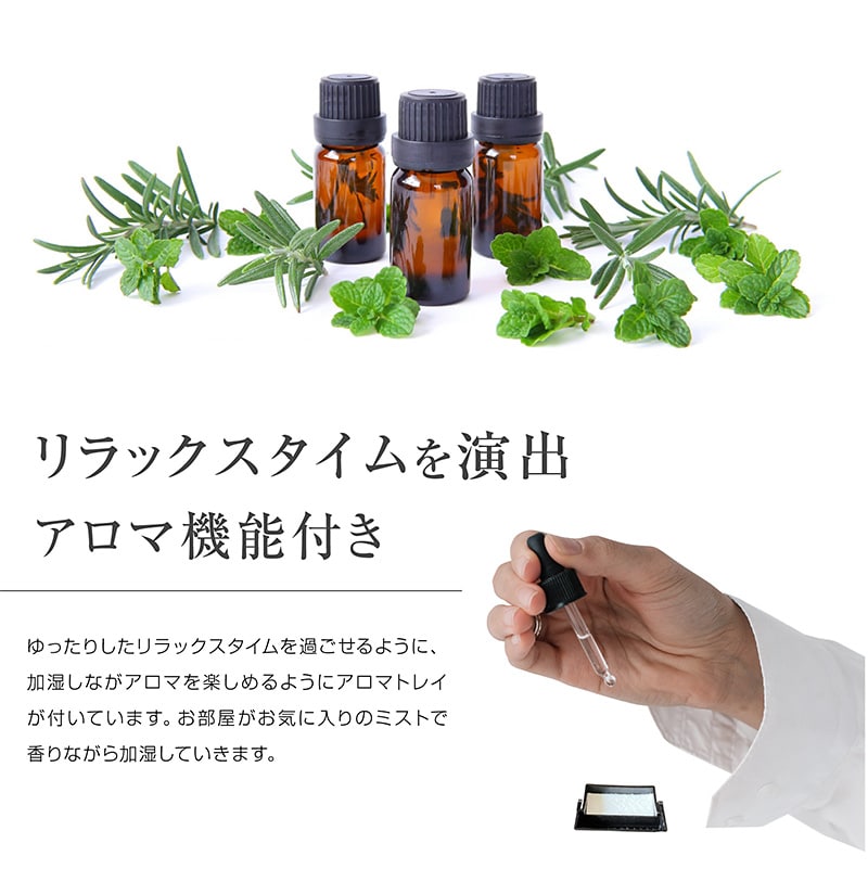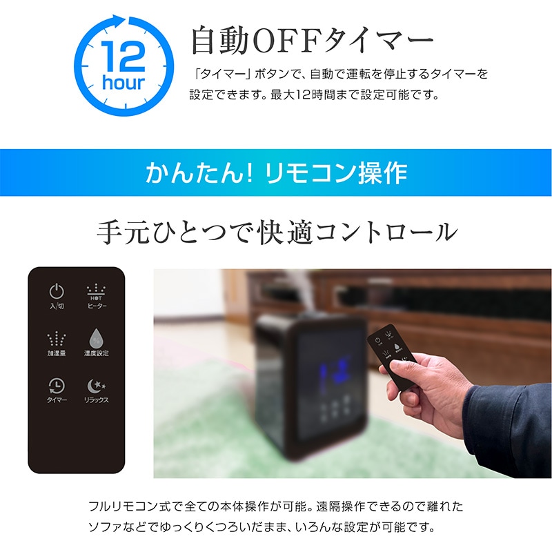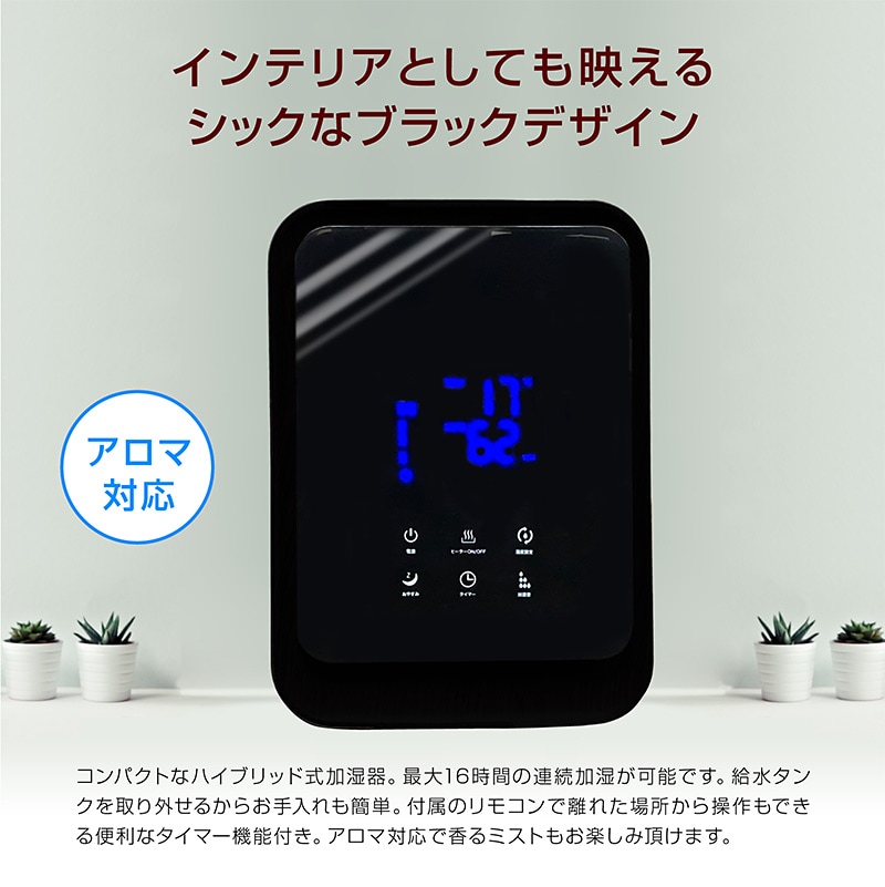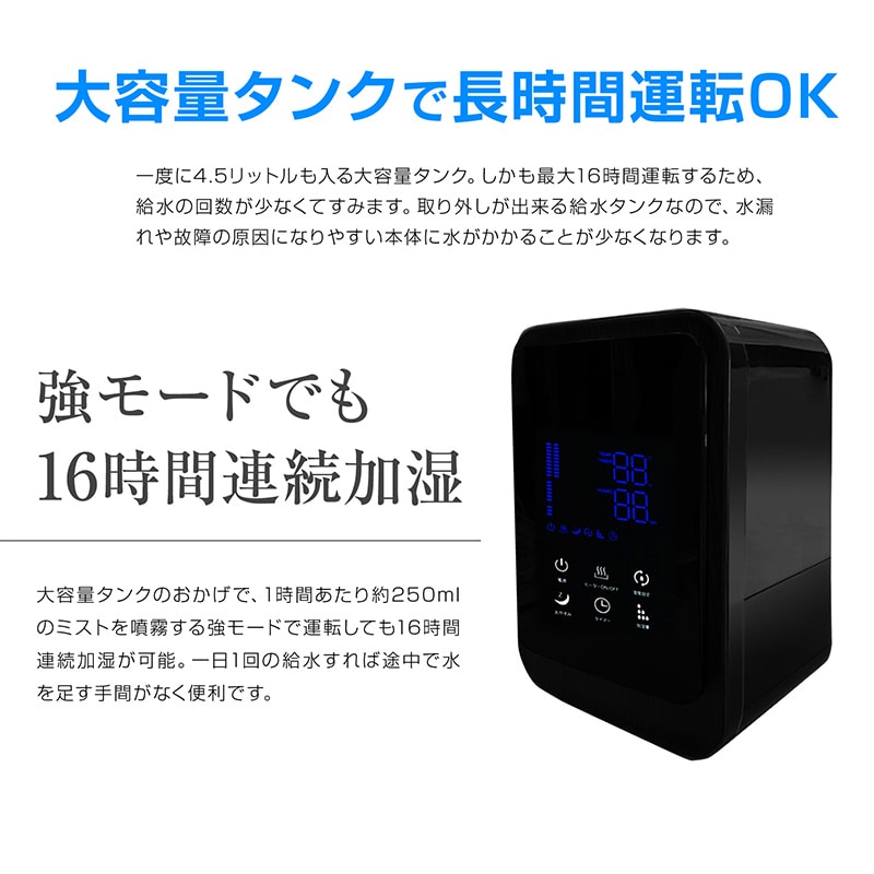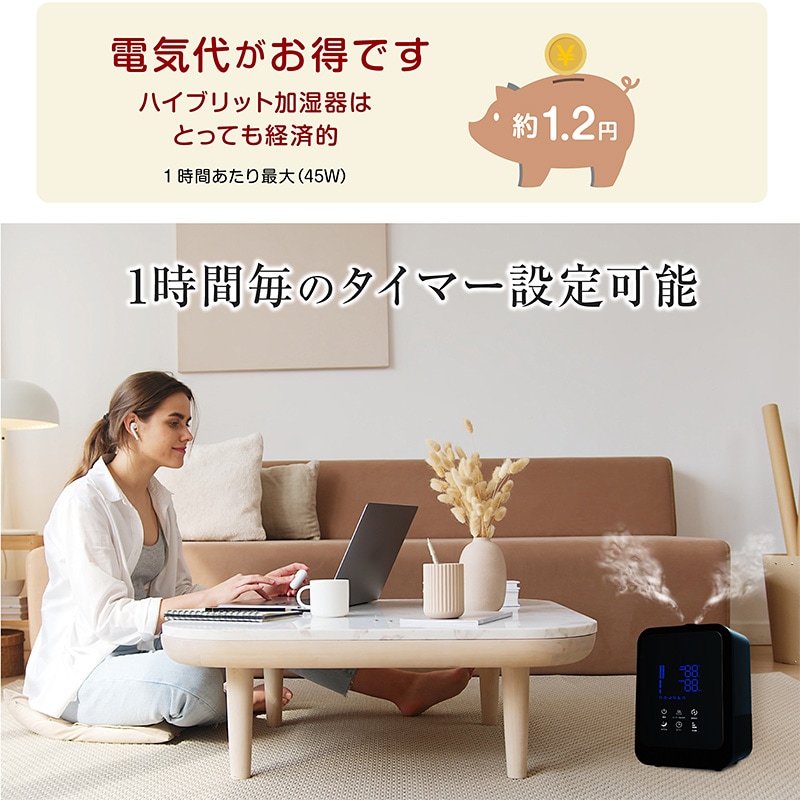 | 特徴 | ・4.5Lハイブリッド加湿器 ヒーター搭載のハイブリッド加湿器です ・ダブルデジタル液晶付き!室温、湿度、切タイマー表示機能を搭載。 ・室内環境が一目でわかる! 連続使用可能15時間 安心して長時間の運転が可能 ・3段階で加湿量を調節できるので給水頻度を下げたい方や狭い空間でも使用が可能 ・オフタイマー機能 就寝時、安心してご使用ができるお休みモードを搭載 ・湿度設定可能 40%から80%の範囲で5%単位でお部屋の湿度を設定 ・夜間表示部消灯可能 就寝時も気になりにくい液晶消灯機能搭載 ・コンパクトでスタイリッシュ お部屋に馴染むスタイリッシュなデザイン |