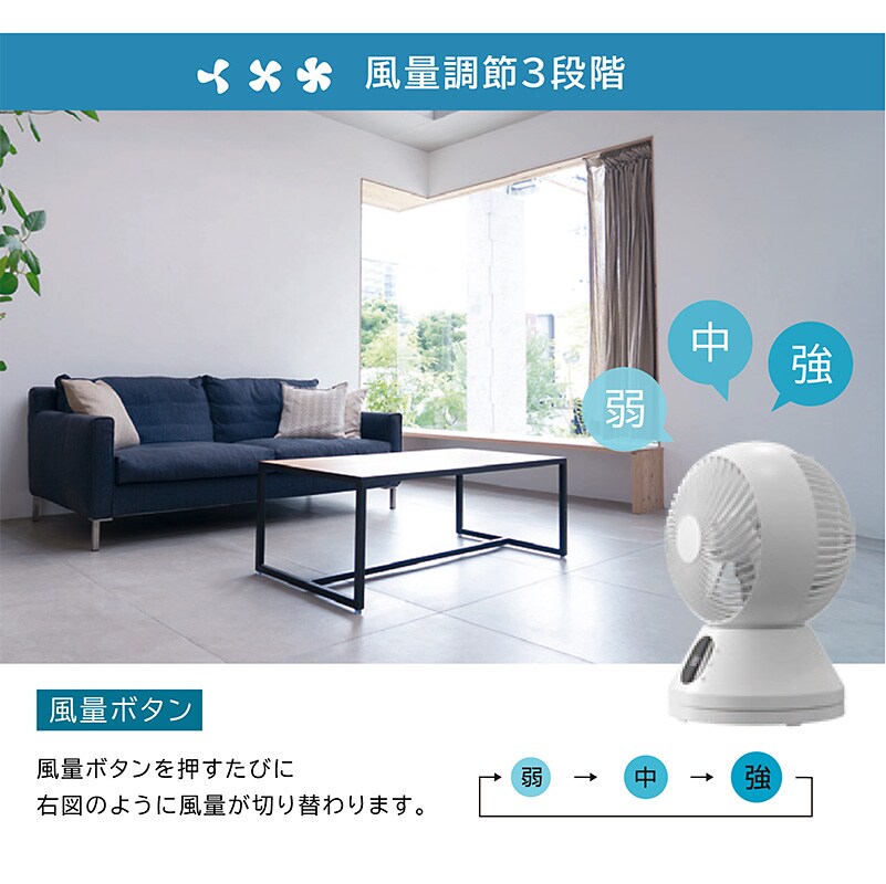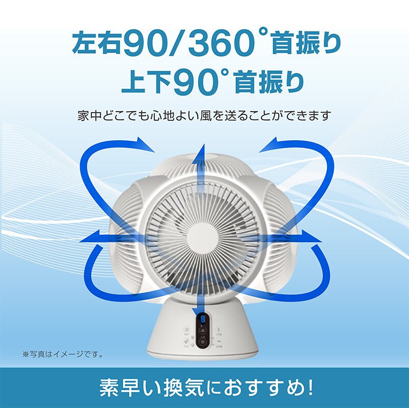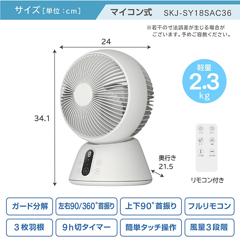| 特徴 | ・ガード類が分解可能でお手入れかんたん ・上下自動首振り約90度 ・左右90度/360度回転でお部屋の隅々まで風を循環! ・3段階の風量調節が可能 弱、中、強のお好みの風を送れます ・扱いやすいマイコン式ボタン ・最大9時間の切タイマー機能付き、切り忘れても安心 ・全ての操作ができるフルリモコン付き |