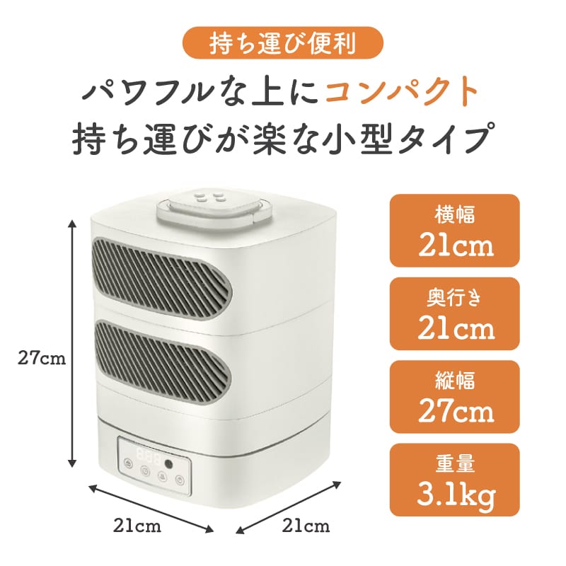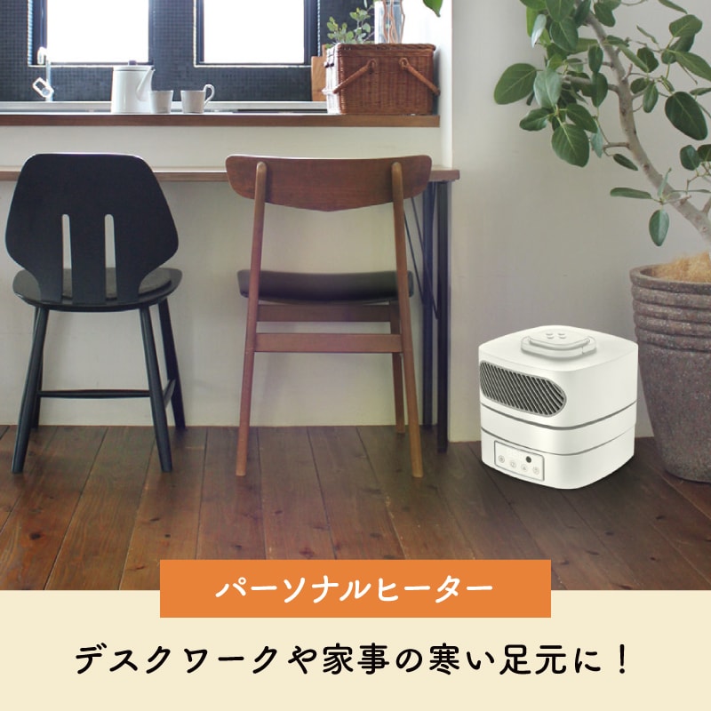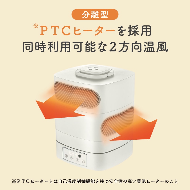 | 特徴 | \ダブルヒーターでパワフルな温風をお届け/ ・自己温度制御機能を持つ安全性の高いPTC(電気)ヒーターを採用 ・2方向に出る温風はシンプルな卓上ヒーターやパーソナルヒーターとして同時利用が可能 ・遠赤外線でからだ全体をあたためて省エネ ・パワフルな上にコンパクト、持ち運びが楽な小型タイプ ・分かりやすい4つのボタンで離れていも付属のリモコンで操作が可能 ・転倒時に自動でオフになり、お子様やペットがいても安心 |