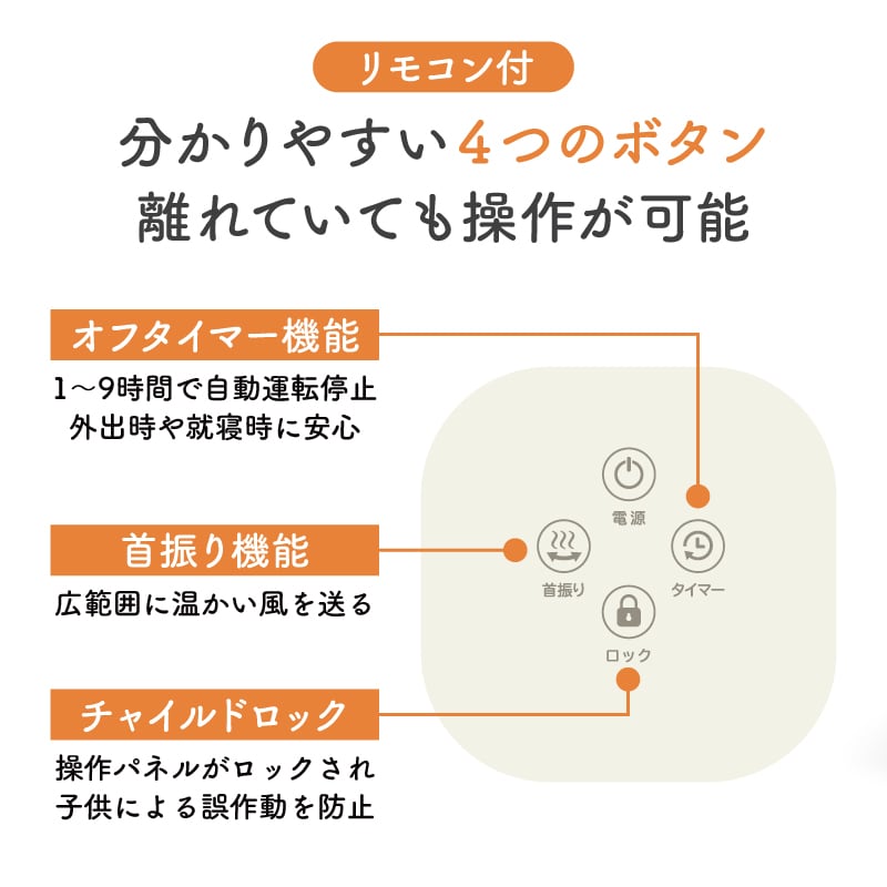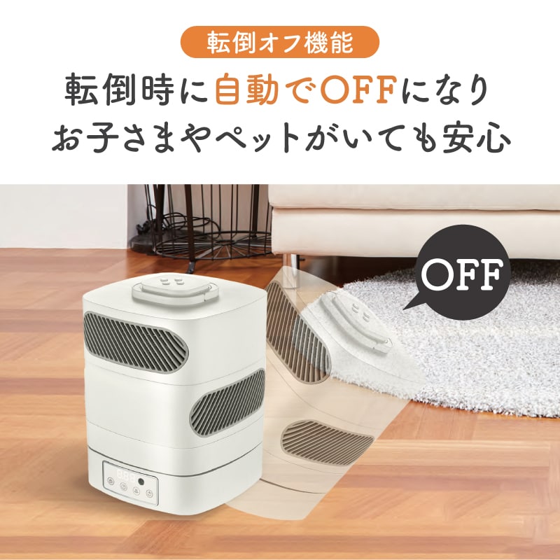 | 機能 | ・転倒オフスイッチ(内蔵落球) ・オフタイマー機能(1?9時間) ・チャイルドロック機能 ・首振り機能 |