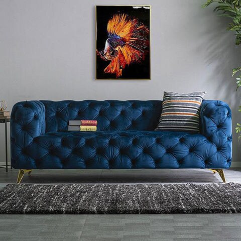 ソファ ソファー 3人掛け 英国調 ベロア生地 ベルベット生地 ボタンダウン チェスターフィールド 3人用 3P ビンテージ風 アンティーク ヴィンセント / ブルー / -ART