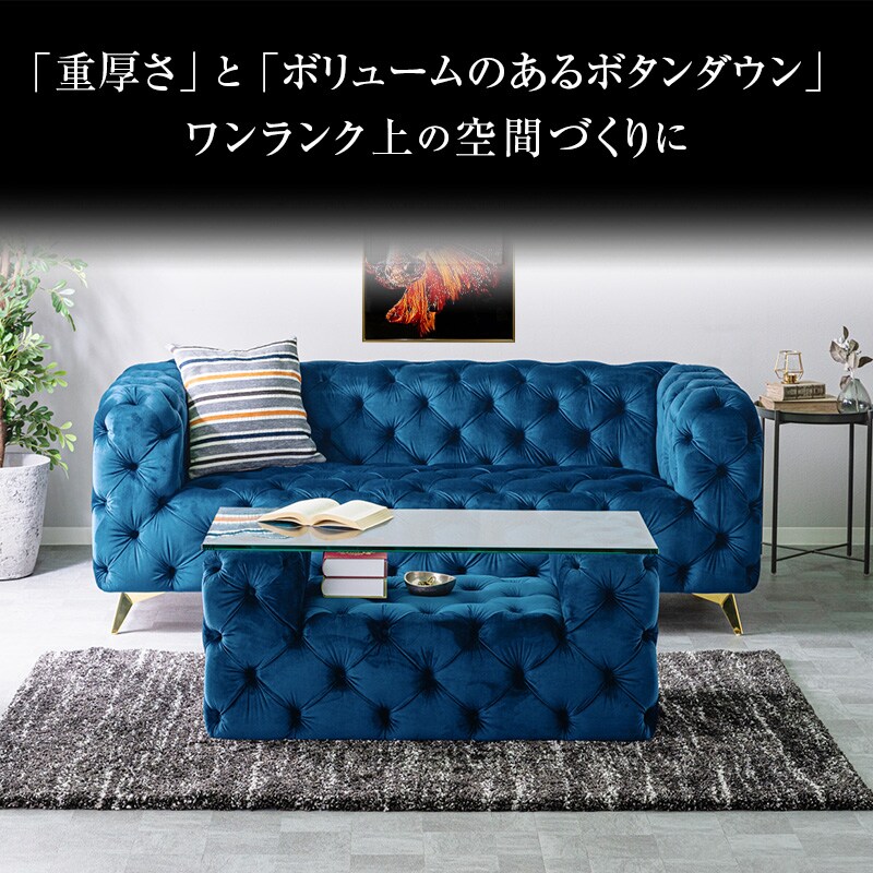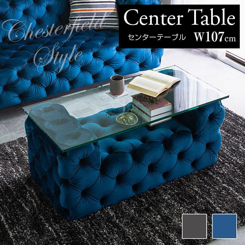 センターテーブル リビングテーブル テーブル ガラステーブル ローテーブル おしゃれ ベルベット生地 チェスターフィールド 強化ガラス 重厚感 ヴィンセント / ブルー / -ART