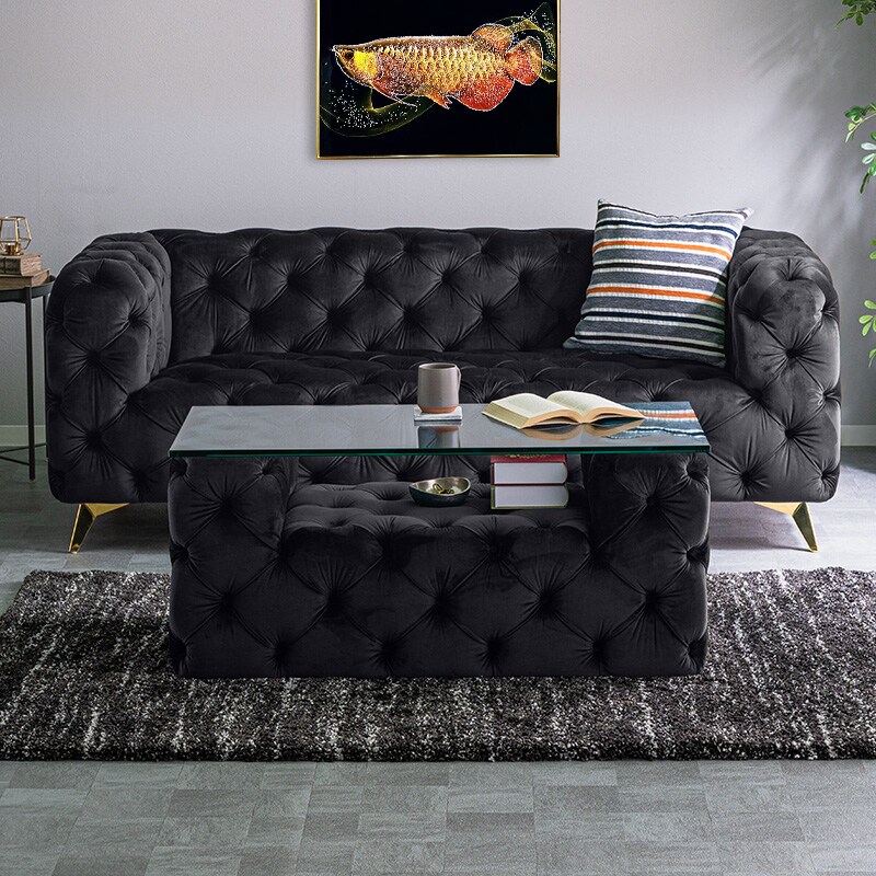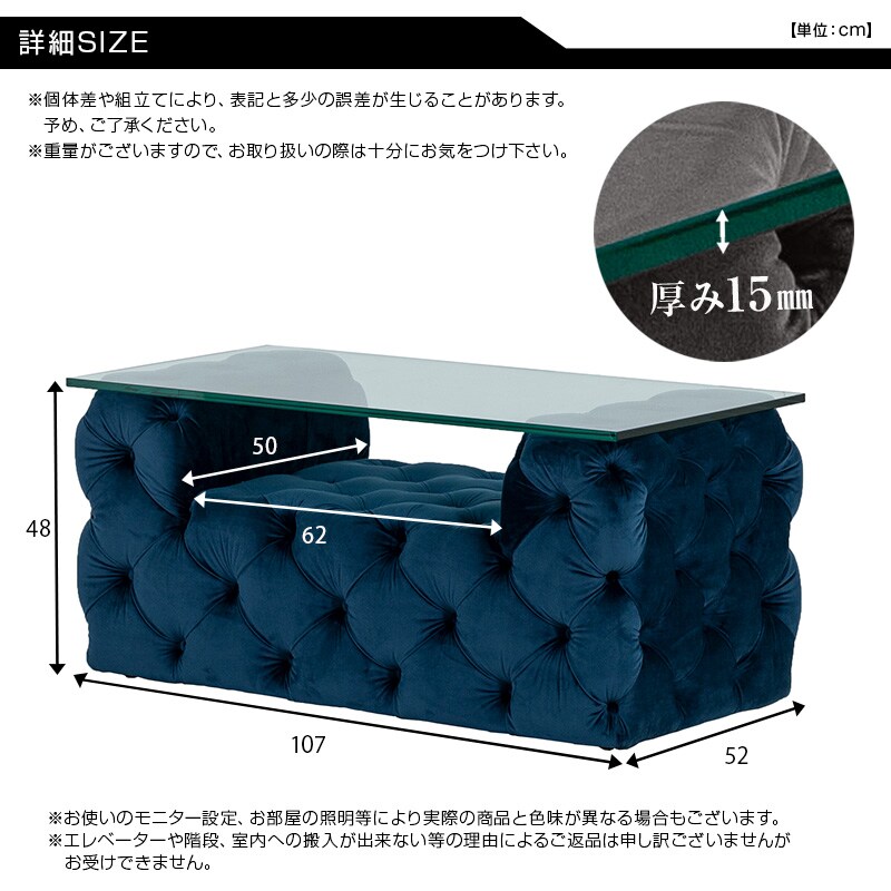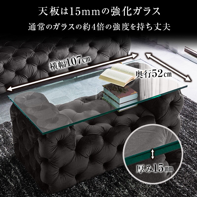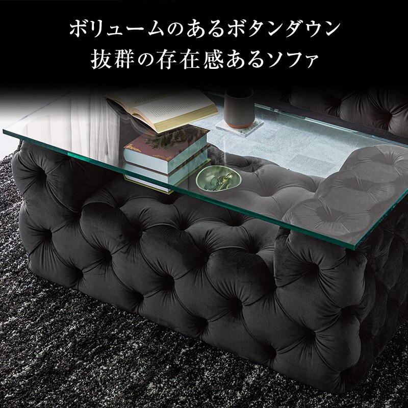 ・手触りのよいベルベッド素材。光沢のある生地で高級感溢れます。 ・英国アンティークのチェスターフィールド風、センターテーブル ・ソファにも合わせやすいサイズ設計。耐久性があるので長くお使い頂けます。 ・普通のガラスに比べて、丈夫な強化ガラス採用。 ・ベルベッド生地とガラスの組み合わせ、異素材を愉しめます |