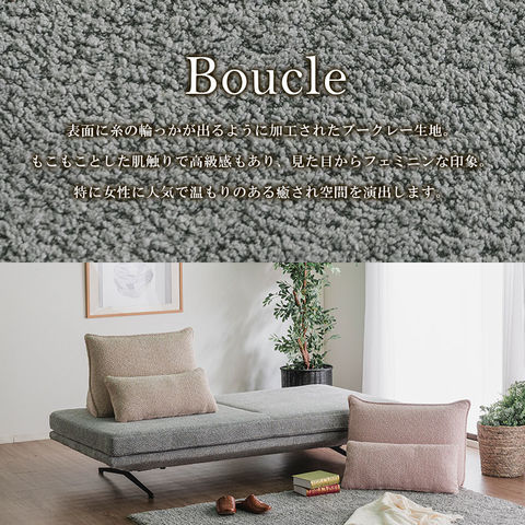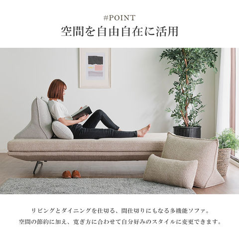 | 特徴 | ※ソファベッド×1、背クッション×2は各色お選びいただけます ・もこもことした肌触りで高級感もあり、見た目からフェミニンで暖かさを感じさせるブークレー生地を使用 ・リビングとダイニングを仕切る、間仕切りにもなる多機能ソファ ・クッションを外せばソファベッドに早変わり ・クッションの底面には強力な滑り止め付きで体重をかけてもずれにくい仕様に ・座面はちょうどいい沈み込みで長時間座れて快適 ・シャープな印象の黒スチール脚とフェミニンな生地で甘辛スタイルに ・お掃除ロボットがスムーズに通るためのスペースがあります |