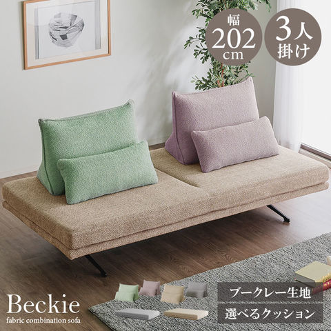 ソファ ソファー 選べる背クッション付き ブークレー ブークレ 幅202cm 3人掛け 3P sofa ソファベッド ソファーベッド ファブリック 大型 ベッキー / ソファカラー:ベージュ / 背クッションカラー:ライトグリーン×ピンク / -ART