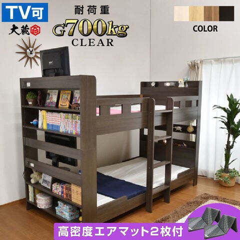 TVが置ける 二段ベッド 2段ベッド 宮付き 大蔵大臣 コンセント付き 本棚付き 寮 下宿 社員 社宅 大人用 耐震 子供 木製 安全 / ダークブラウン / (エアーアートマットレス2枚付) -ART
