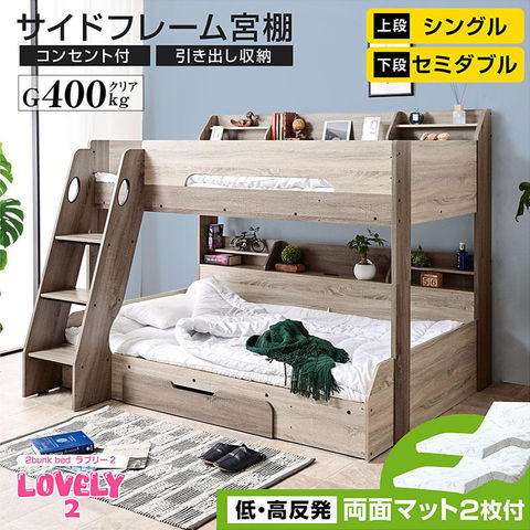二段ベッド 2段ベッド 親子ベッド 下段セミダブル 分離可能 耐荷重400kg ロータイプ 宮棚付き コンセント付 シングル対応 大人用 ラブリー2 / オーク / (低反発 高反発 両面マット2枚付) -ART