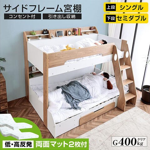 \家族で使える、多機能親子ベッド/ ・上段はシングルベッド、下段はセミダブルベッド ・上下分割可能でそれぞれ独立して使える ・上下段サイドにワイド宮棚付き 本や小物が置けて便利 ・ワイド宮棚にはコンセント付きでスマホなどの充電可能 ・昇り降りに安定感がある階段式 左右どちらにも取付可能 ・下段ヘッド下は引き出し収納付き、キャスター付きで動きがスムーズ ・上下連結には金属性ダボ、木ダボが2本使用で、頑丈なつくり ・オールシーズン快適なスノコ床板、ロールタイプで設置も簡単 |