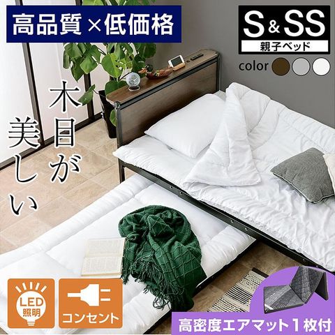 ・コンパクトに収納できる親子ベッド。親ベッドはシングルサイズに、子ベッドはセミシングルサイズに適合 ・使う時に引き出せるので、一人暮らしから親子までいろんなシーンで使えます。 ・安心のISO9001認定工場で生産 ・親ベッドには木製の宮棚付きで小物を置くのに便利 ・2口コンセント付きで就寝中にスマホの充電もできます ・LEDライトはおしゃれな間接照明で眩しくなく、やさしく暗闇を照らします。 ・子ベッドはキャスター付きで軽い力で出し入れが可能 ・キャスターはストッパー付で、不意に動く事を抑え安心してお休み頂けます。 ・オールシーズン快適なメッシュ床板 ・子ベッドを収納スペースとして使う事もできます! |