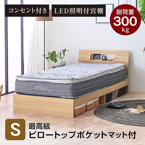 宮棚 ライト コンセント付き ベッド シングル ベット おしゃれ すのこベッド 木製ベッド LEN-レン / ナチュラル / (高級ピロートップポケットマット付) -ART