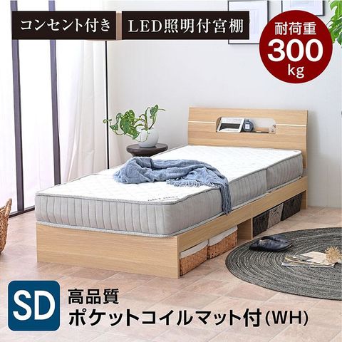 宮棚 ライト コンセント付き ベッド フレーム セミダブル ベット おしゃれ すのこベッド 木製ベッド LEN-レン / ベッド:ナチュラル / マットレス:ホワイト / (圧縮ポケットマット付) -ART