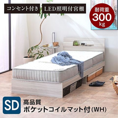 宮棚 ライト コンセント付き ベッド フレーム セミダブル ベット おしゃれ すのこベッド 木製ベッド LEN-レン / ベッド:ホワイトグレー / マットレス:ホワイト / (圧縮ポケットマット付) -ART