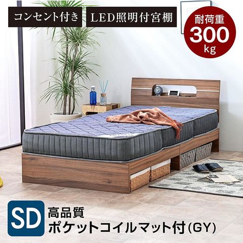 宮棚 ライト コンセント付き ベッド フレーム セミダブル ベット おしゃれ すのこベッド 木製ベッド LEN-レン / ベッド:ウォールナット / マットレス:グレー / (圧縮ポケットマット付) -ART