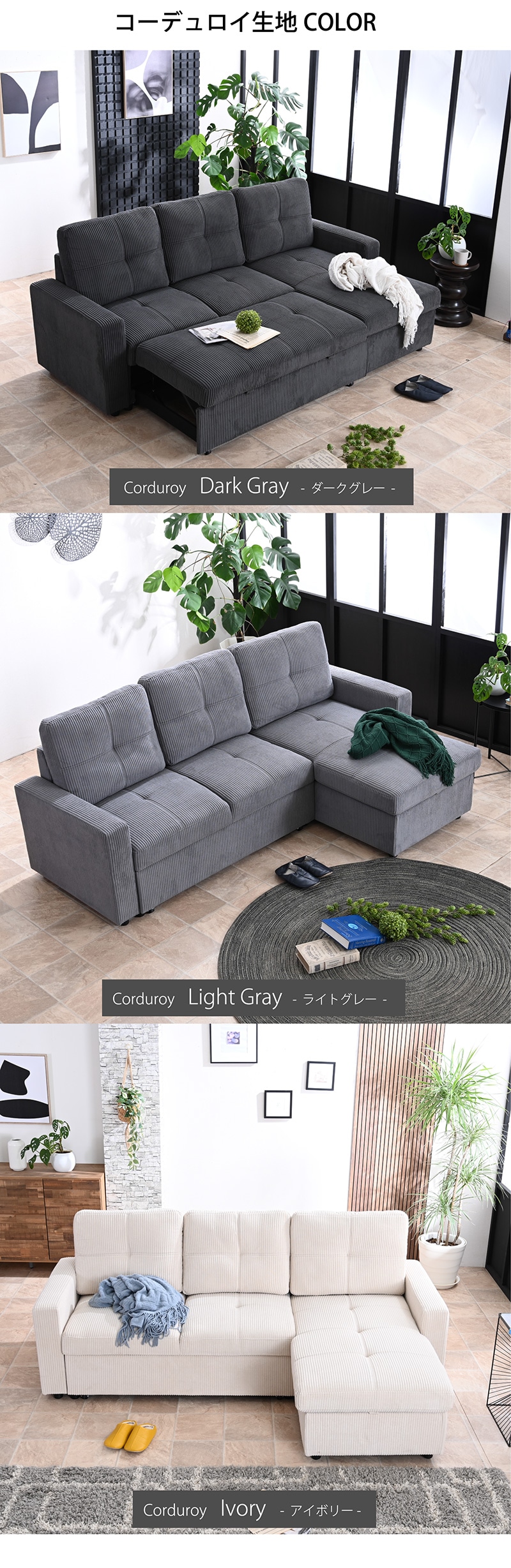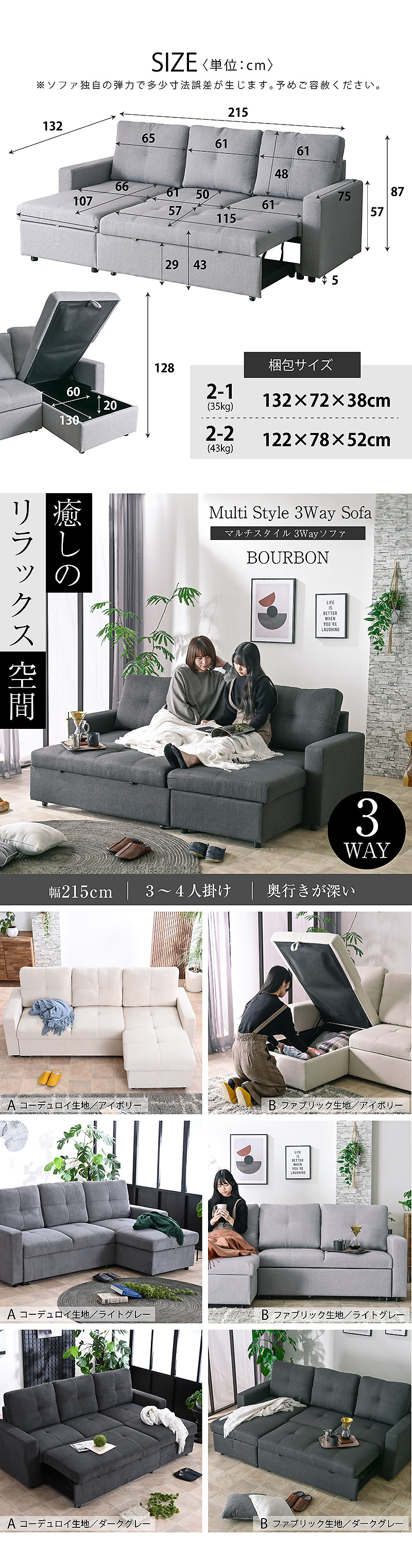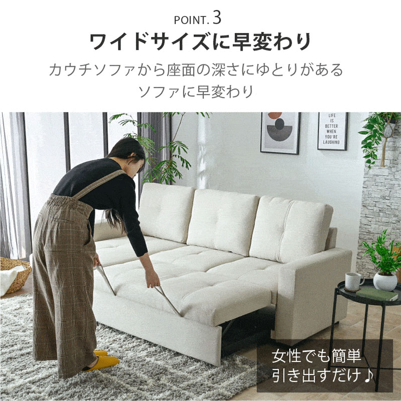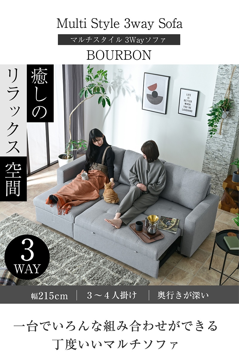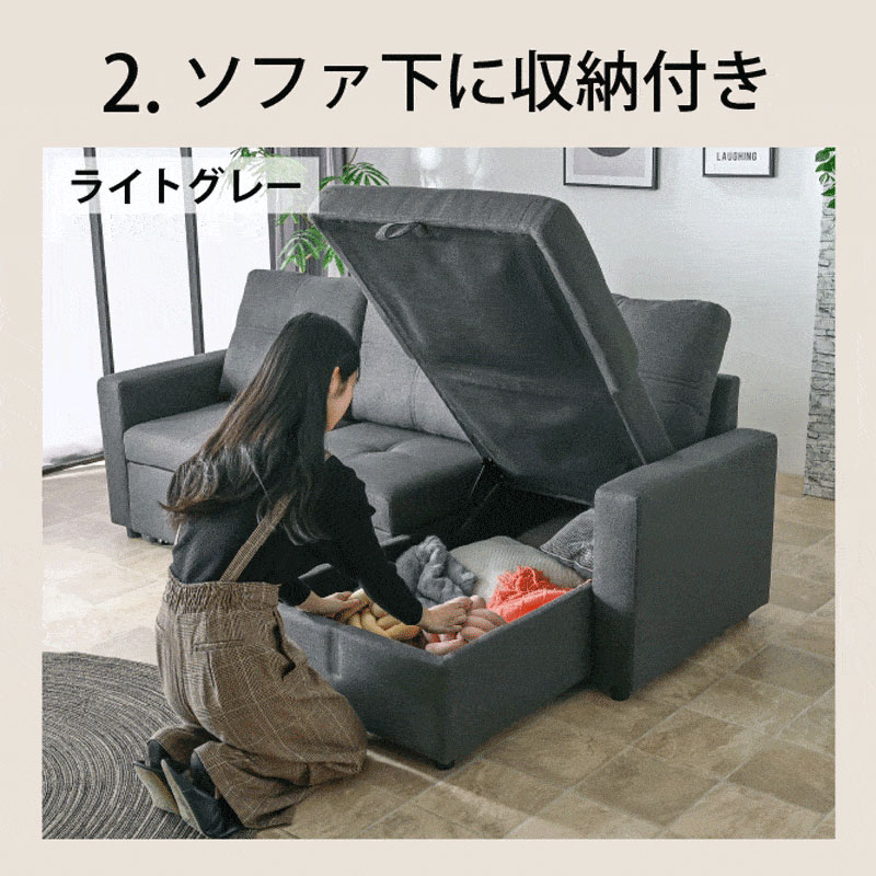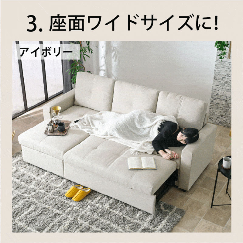 ソファー 3WAY ソファ 収納付き 座面が深い 分離可能 カウチソファ マルチ ベッド ソファベッド ブルボン / ソファカラー:アイボリー / ソファ生地:コーデュロイ / -ART
