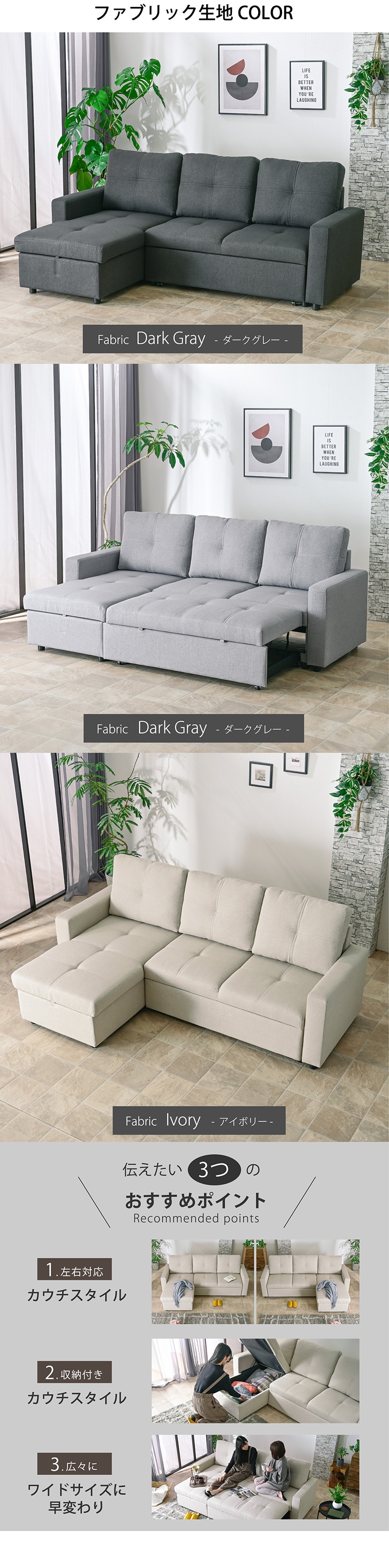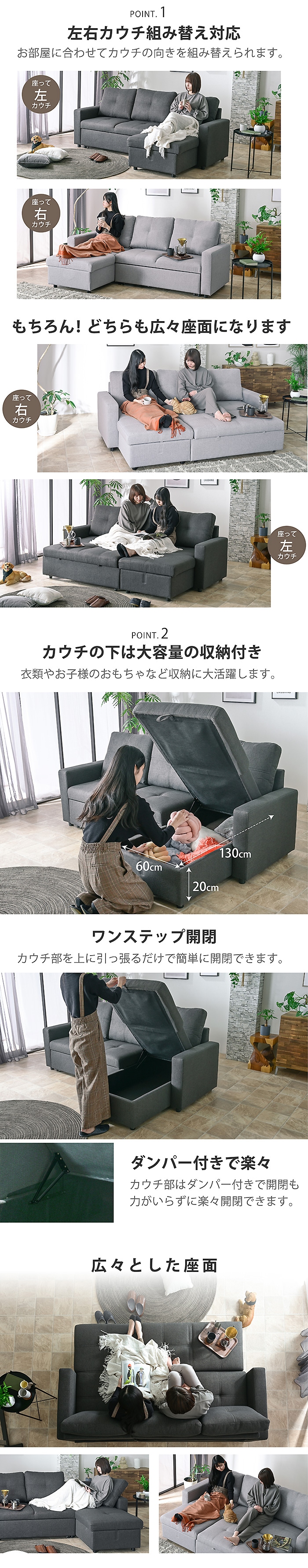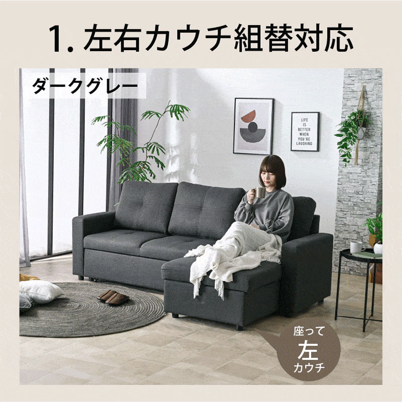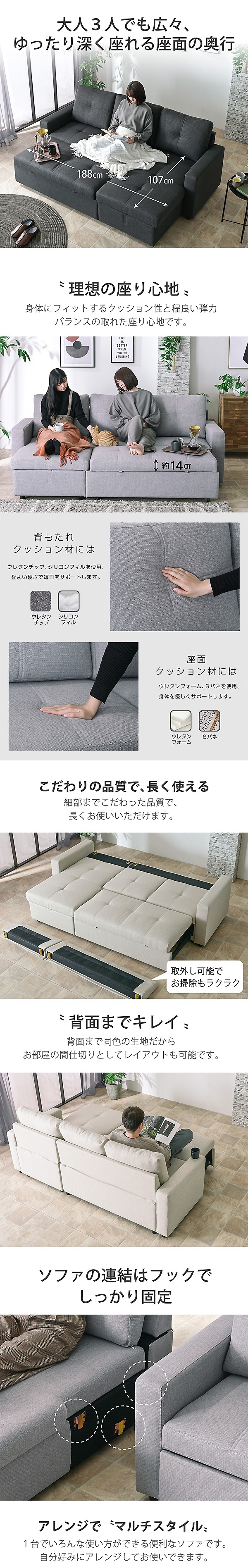 \一台でいろんな組み合わせができる丁度いいマルチソファ/ ・選べる生地2タイプ(ファブリック・コーデュロイ) ・カウチソファから座面の深さにゆとりがあるワイドソファに早変わり ・大人3人でも広々、ゆったり深く座れる座面の奥行き ・カウチ下は大容量の収納付きで大活躍 ・カウチ部分を上に引っ張るだけで簡単に開閉 ・ソファの連結はフックでしっかり固定 ・お部屋に合わせてカウチの向きを組み替えられる ・通年快適に使用できる手触りのいいファブリック生地 ・身体にフィットするクッション性と程よい弾力でバランスの取れた座り心地 ・背面まで同色の生地だからお部屋の間切りとしても ・細部までこだわった品質で長く使える |
